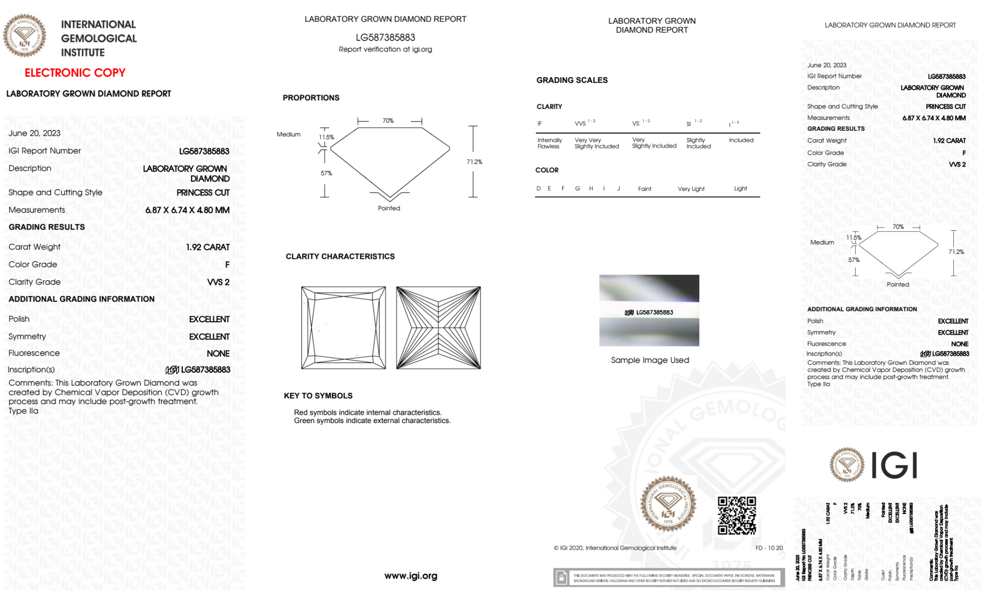 Your 1.92 carat Princess lab diamond is graded F color (Colorless), and you can read more about F color diamonds here.