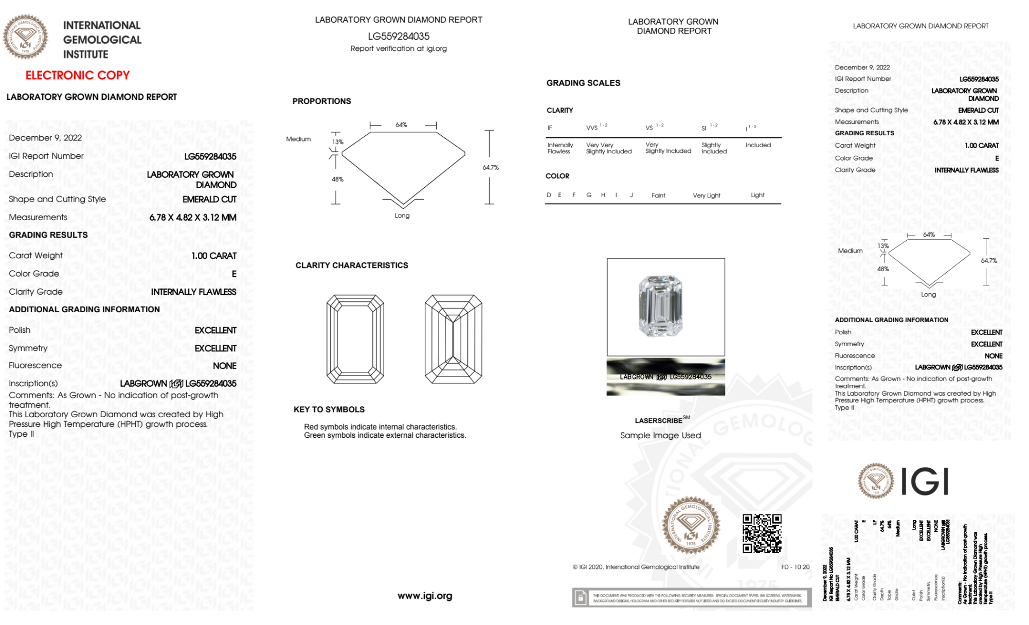 Your 1.00 carat Emerald lab diamond is graded IF clarity, which stands for Internally Flawless. Read more about IF clarity diamonds here, or learn more about diamond clarity in general here.