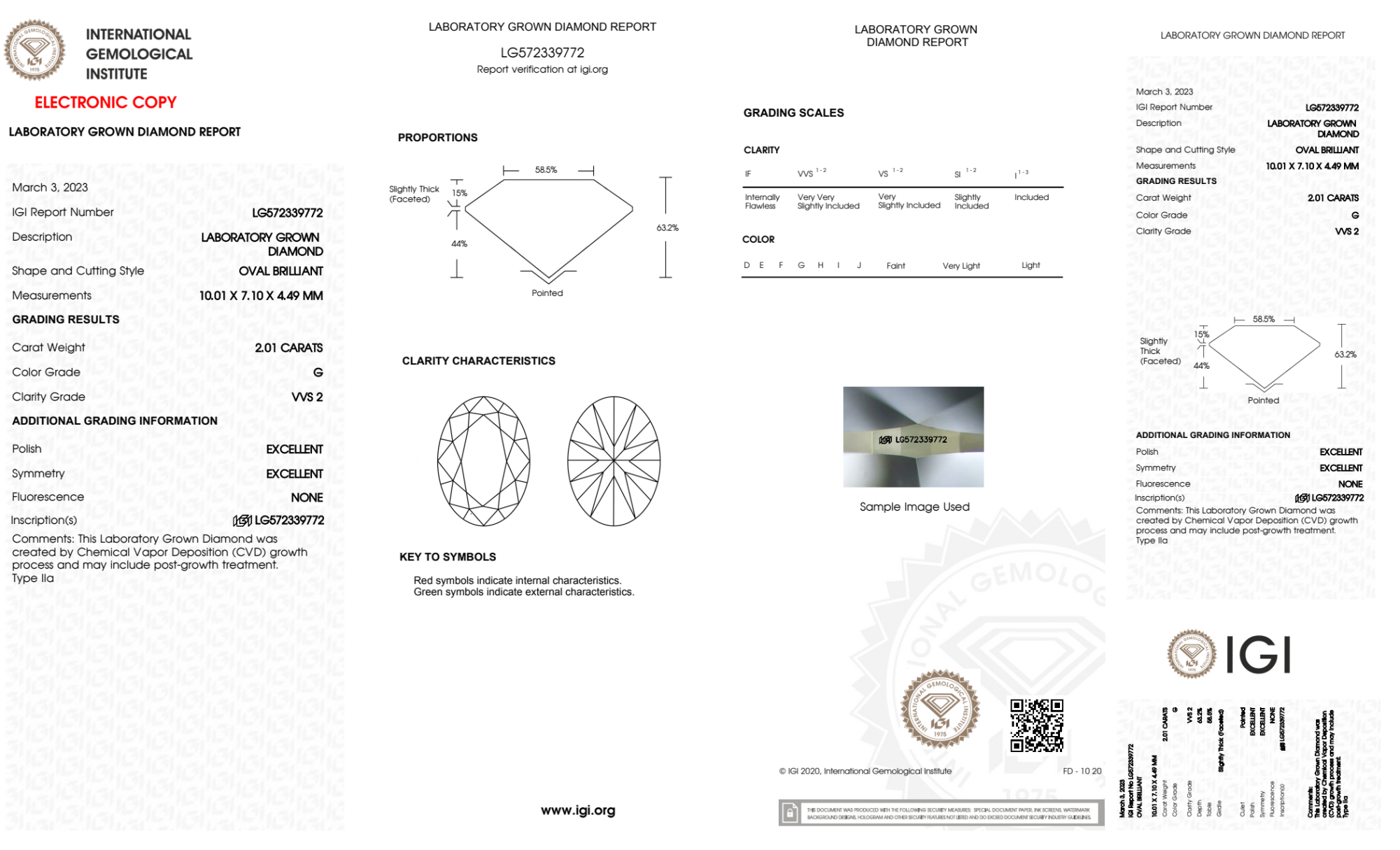 Your 2.01 carat Oval lab diamond is graded G color (Near Colorless), and you can read more about G color diamonds here.
