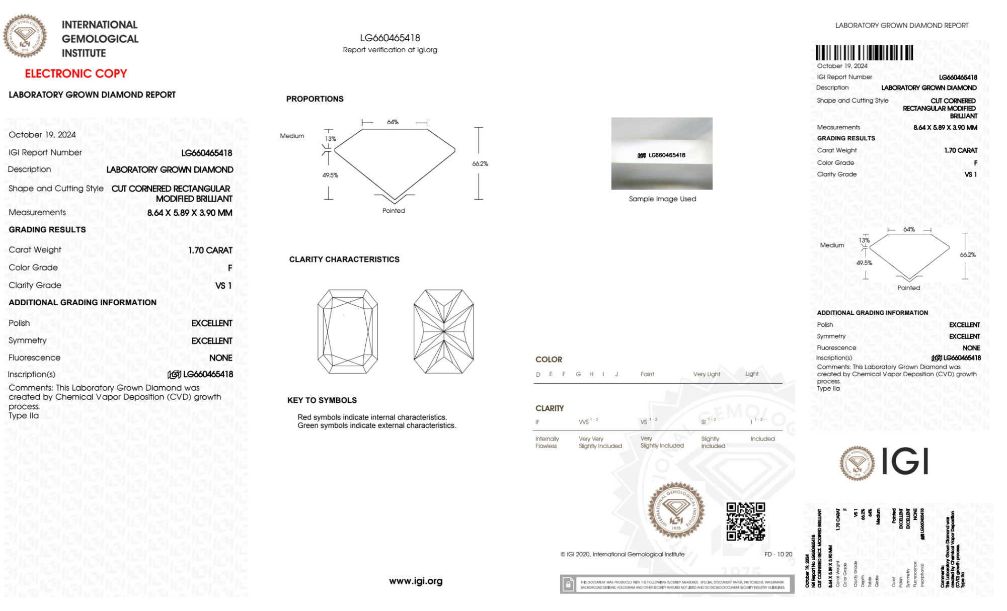 Your 1.70 carat Radiant lab diamond is graded F color (Colorless), and you can read more about F color diamonds here.