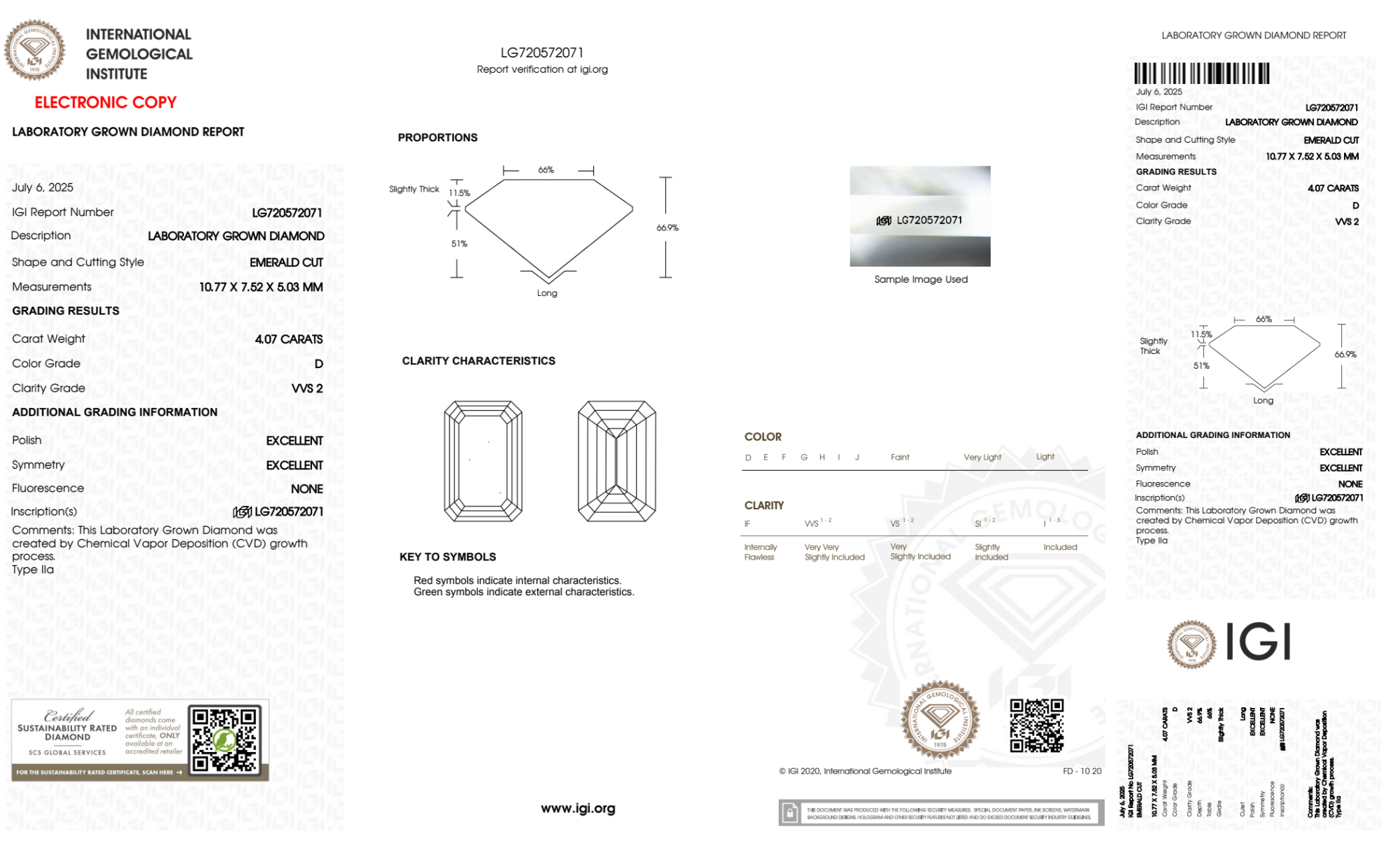 Your 4.07 carat Emerald lab diamond is graded D color (Colorless), and you can read more about D color diamonds here.