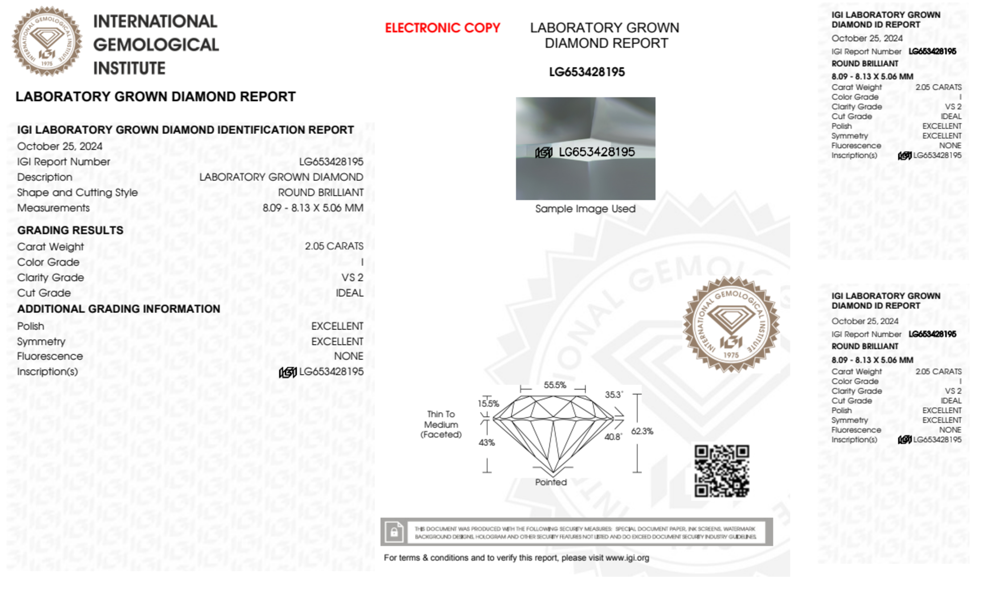 Your 2.05 carat Round lab diamond is graded I color (Near Colorless), and you can read more about I color diamonds here.