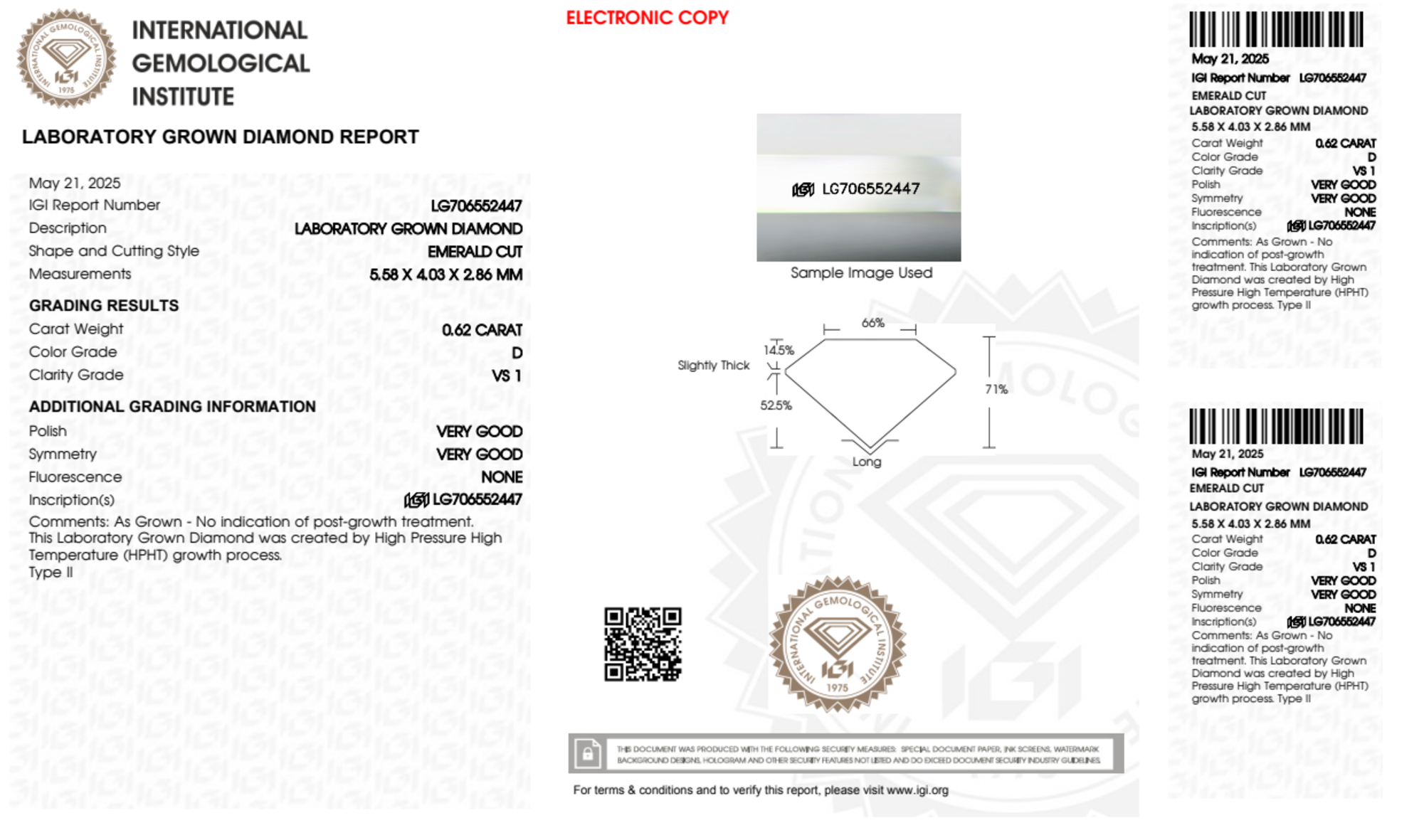 Your 0.62 carat Emerald lab diamond is graded D color (Colorless), and you can read more about D color diamonds here.