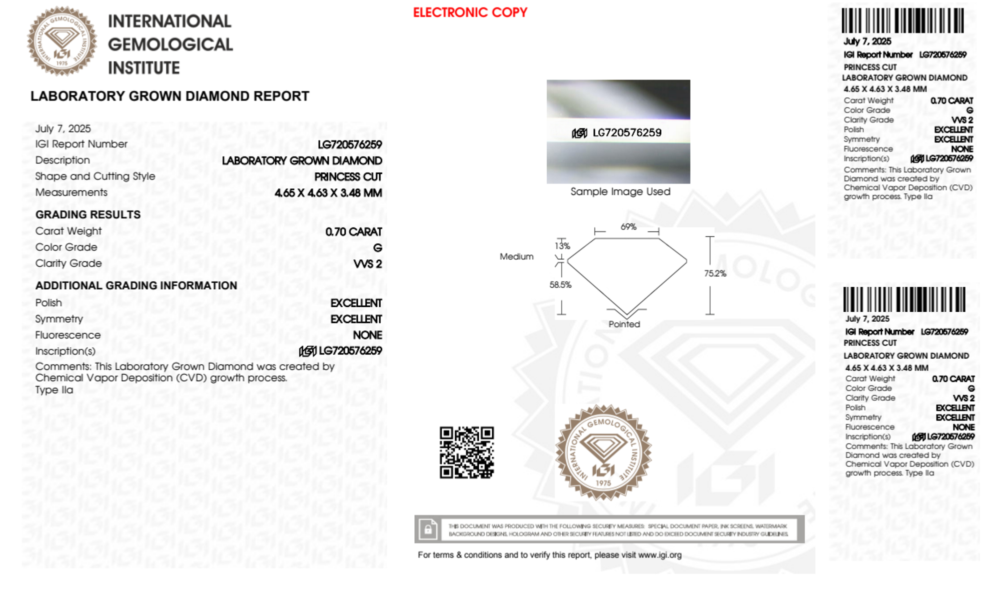 Your 0.70 carat Princess lab diamond is graded G color (Near Colorless), and you can read more about G color diamonds here.