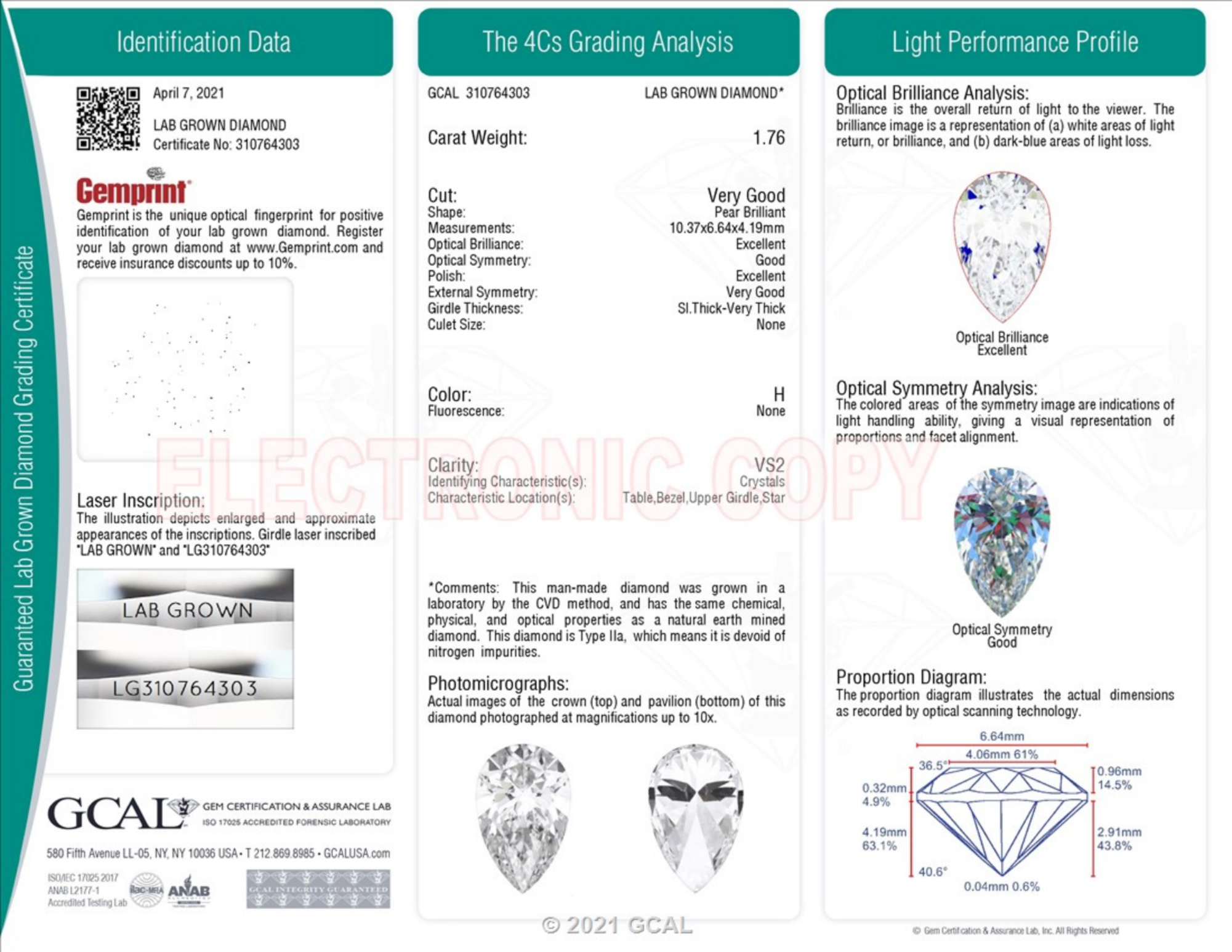1.76 Carat pear lab Diamond