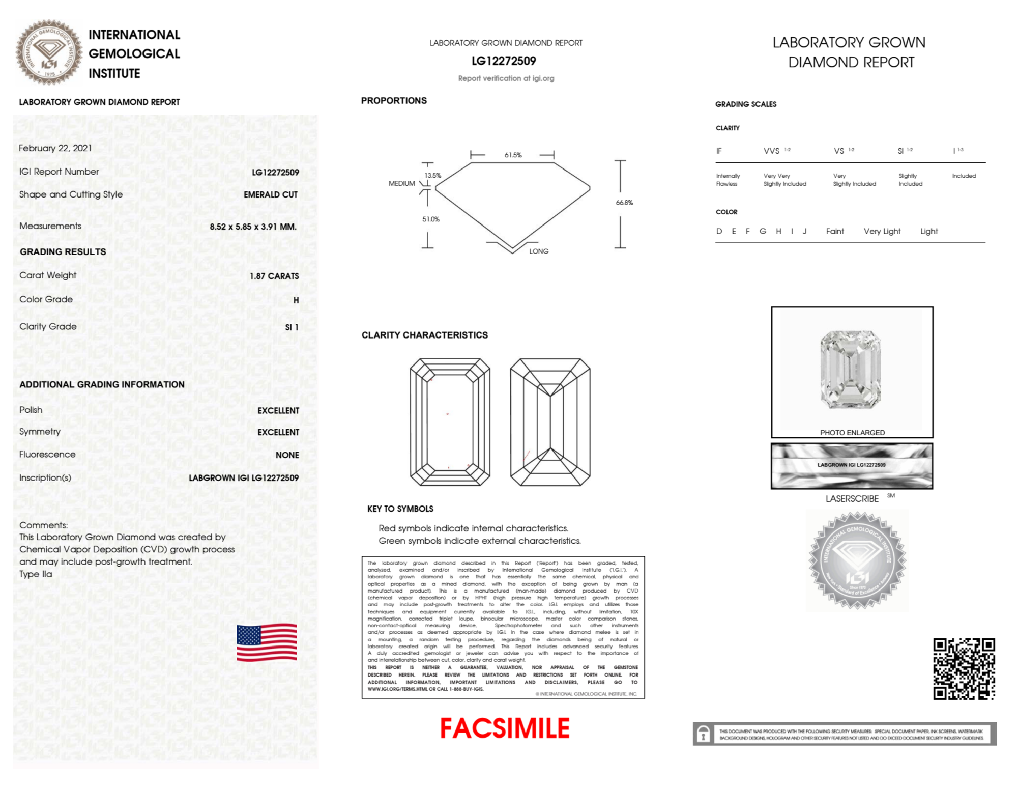 Your 1.87 carat Emerald lab diamond is graded SI1 clarity, which stands for Slightly Included 1. Read more about SI1 clarity diamonds here, or learn more about diamond clarity in general here.
