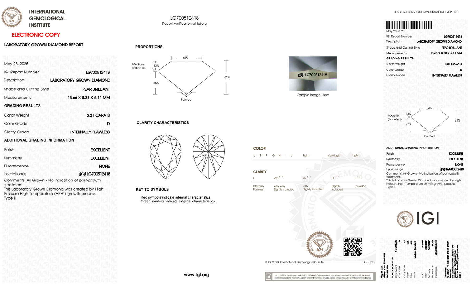Your 3.31 carat Pear lab diamond is graded IF clarity, which stands for Internally Flawless. Read more about IF clarity diamonds here, or learn more about diamond clarity in general here.