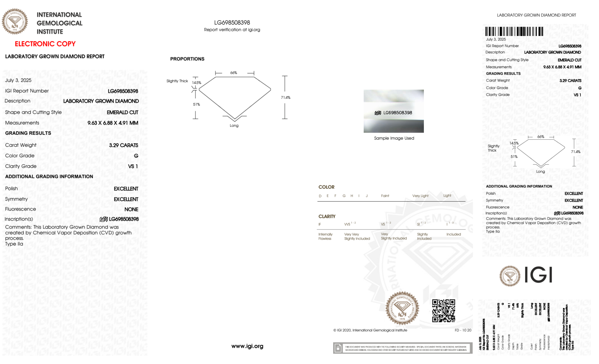 Your 3.29 carat Emerald lab diamond is graded G color (Near Colorless), and you can read more about G color diamonds here.