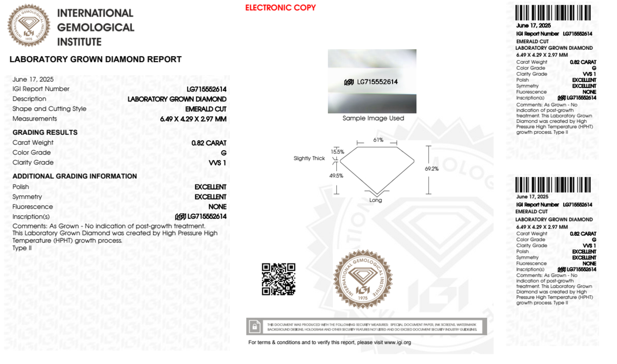 Your 0.82 carat Emerald lab diamond is graded VVS1 clarity, which stands for Very Very Slightly Included 1. Read more about VVS1 clarity diamonds here, or learn more about diamond clarity in general here.