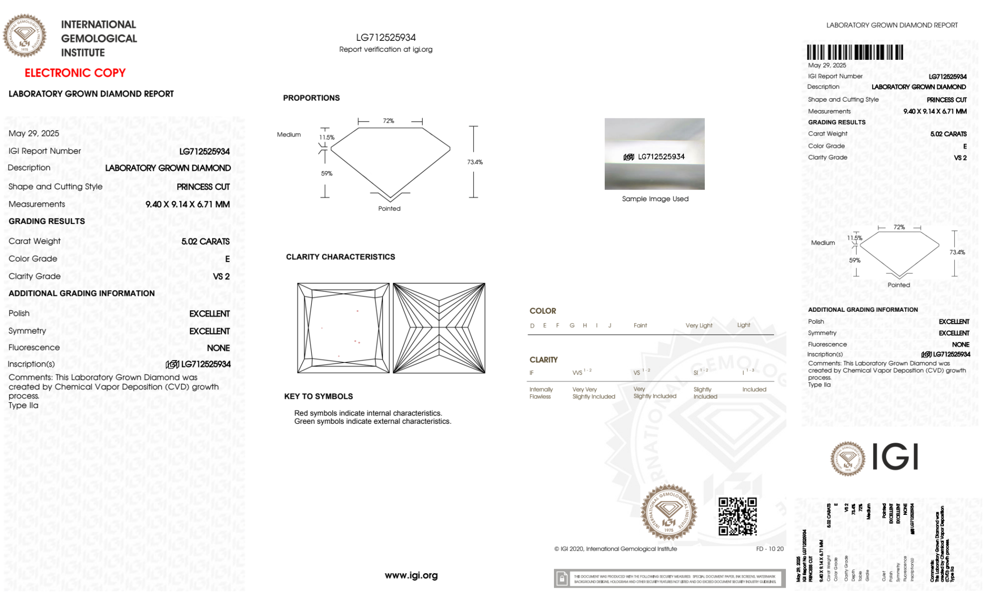 Your 5.02 carat Princess lab diamond is graded E color (Colorless), and you can read more about E color diamonds here.