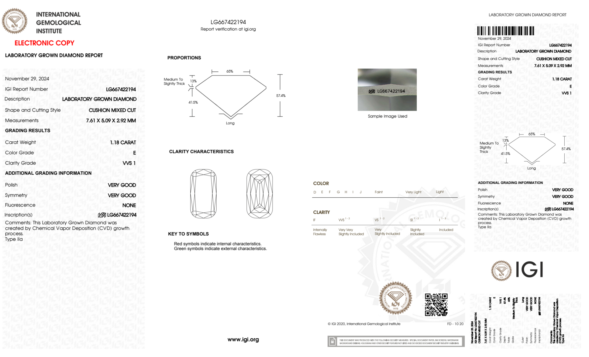 Your 1.18 carat Cushion lab diamond is graded E color (Colorless), and you can read more about E color diamonds here.