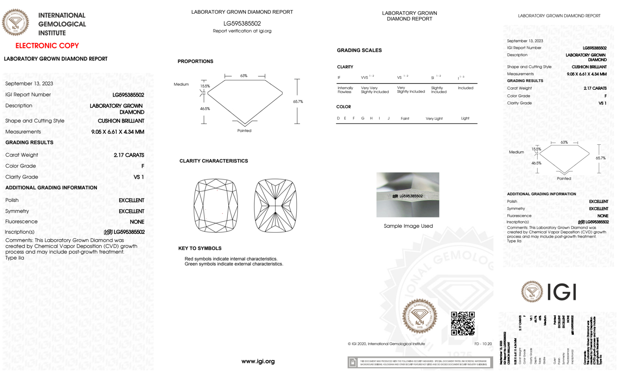 Your 2.17 carat Cushion lab diamond is graded F color (Colorless), and you can read more about F color diamonds here.