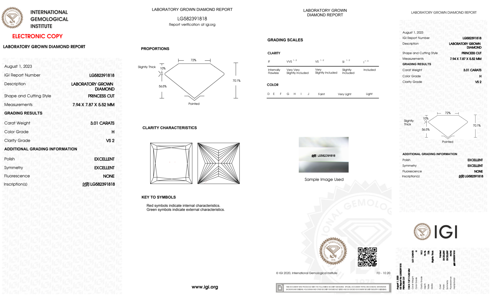 Your 3.01 carat Princess lab diamond is graded H color (Near Colorless), and you can read more about H color diamonds here.