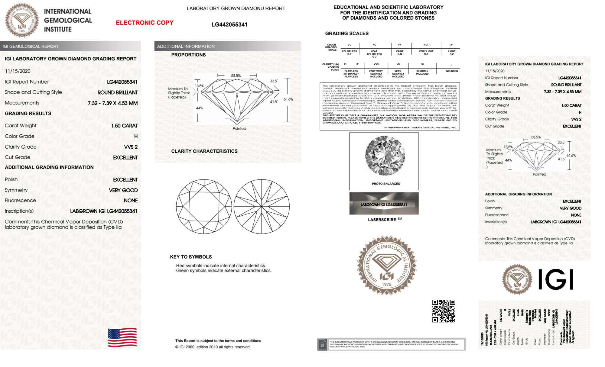Your 1.50 carat Round lab diamond is graded H color (Near Colorless), and you can read more about H color diamonds here.
