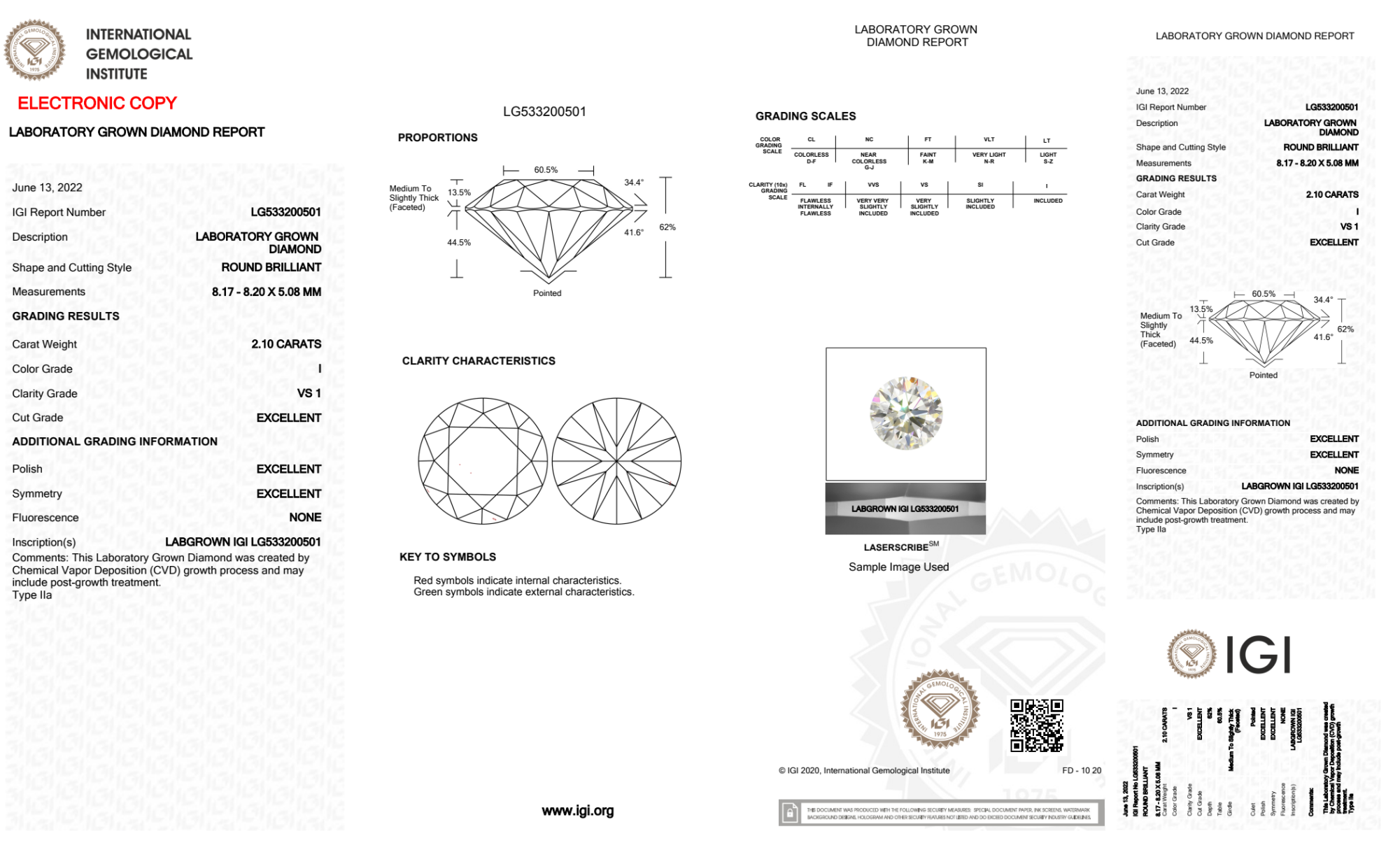 Your 2.10 carat Round lab diamond is graded I color (Near Colorless), and you can read more about I color diamonds here.