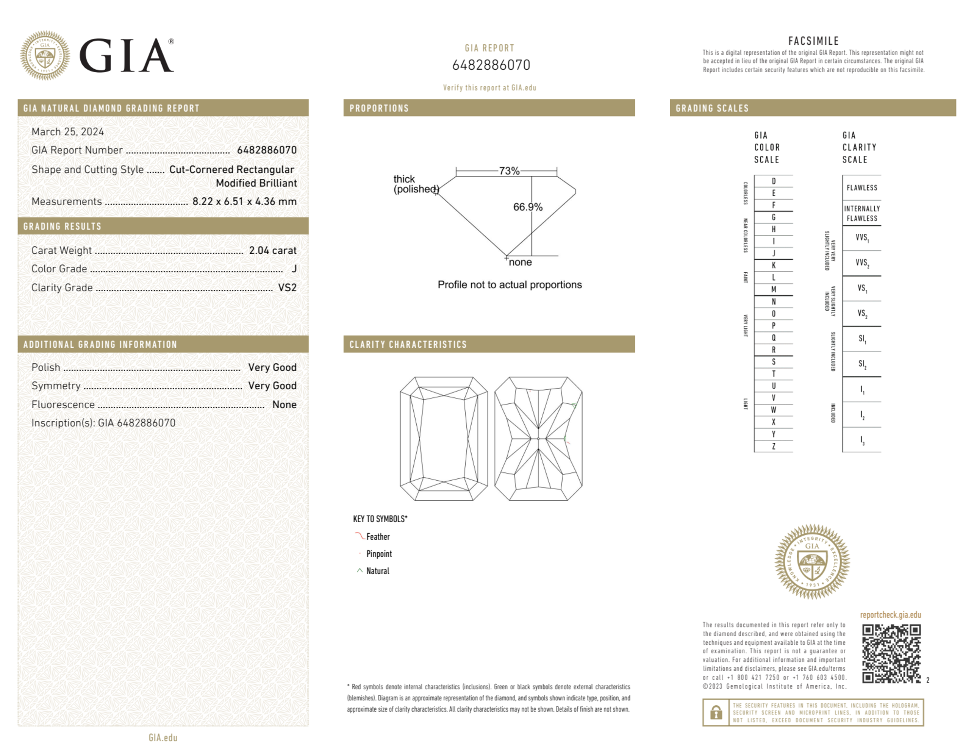 Your 2.04 carat Radiant natural diamond is graded VS2 clarity, which stands for Very Slightly Included 2. Read more about VS2 clarity diamonds here, or learn more about diamond clarity in general here.