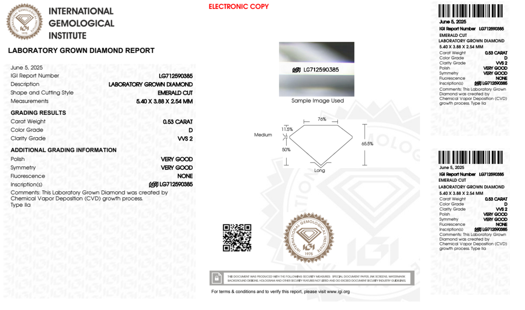 Your 0.53 carat Emerald lab diamond is graded D color (Colorless), and you can read more about D color diamonds here.