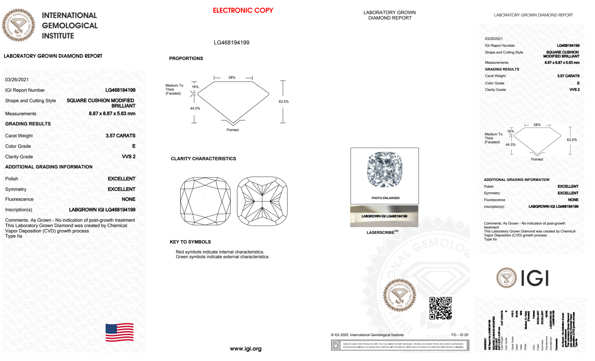 Your 3.57 carat Cushion lab diamond is graded E color (Colorless), and you can read more about E color diamonds here.