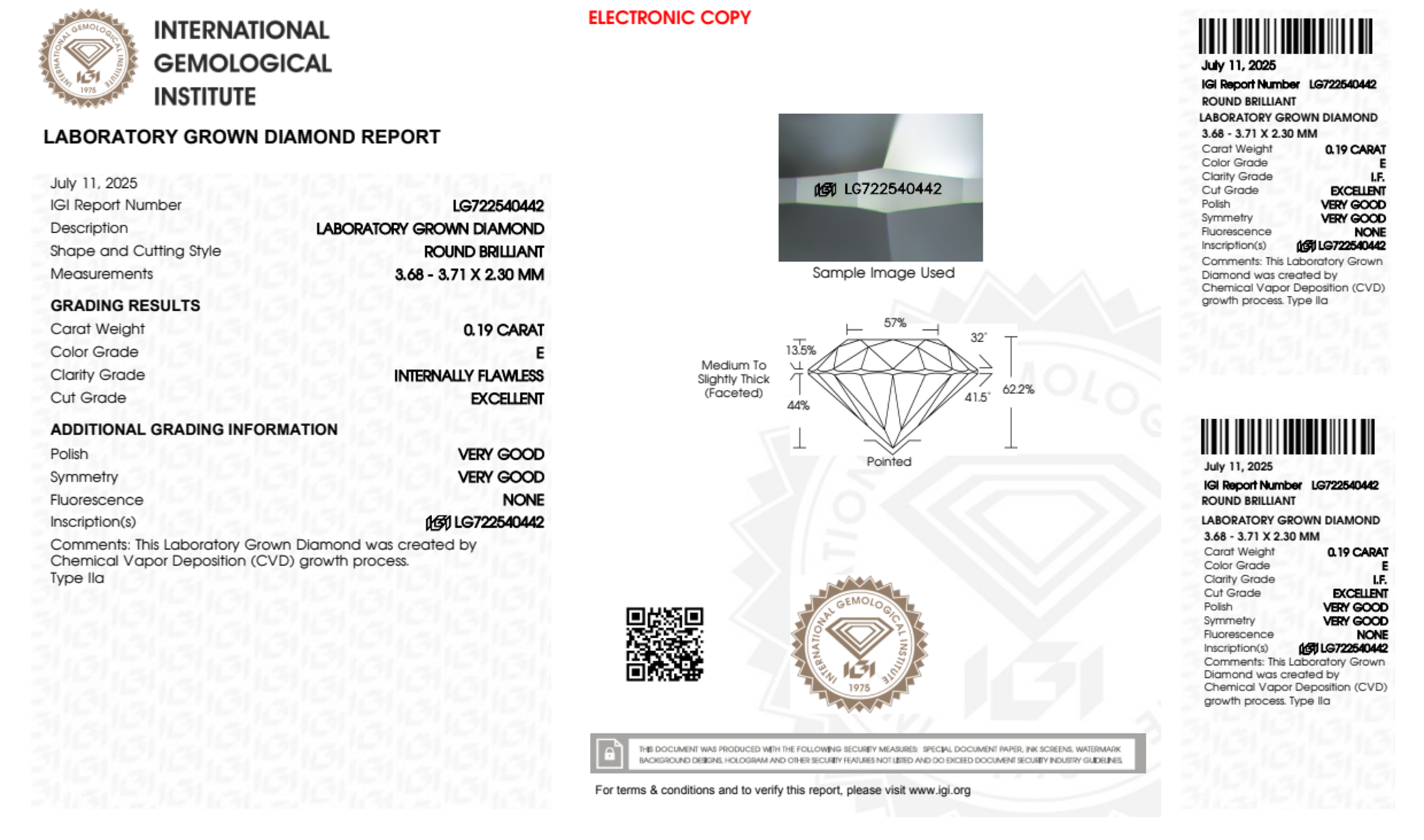 Your 0.19 carat Round lab diamond is graded IF clarity, which stands for Internally Flawless. Read more about IF clarity diamonds here, or learn more about diamond clarity in general here.