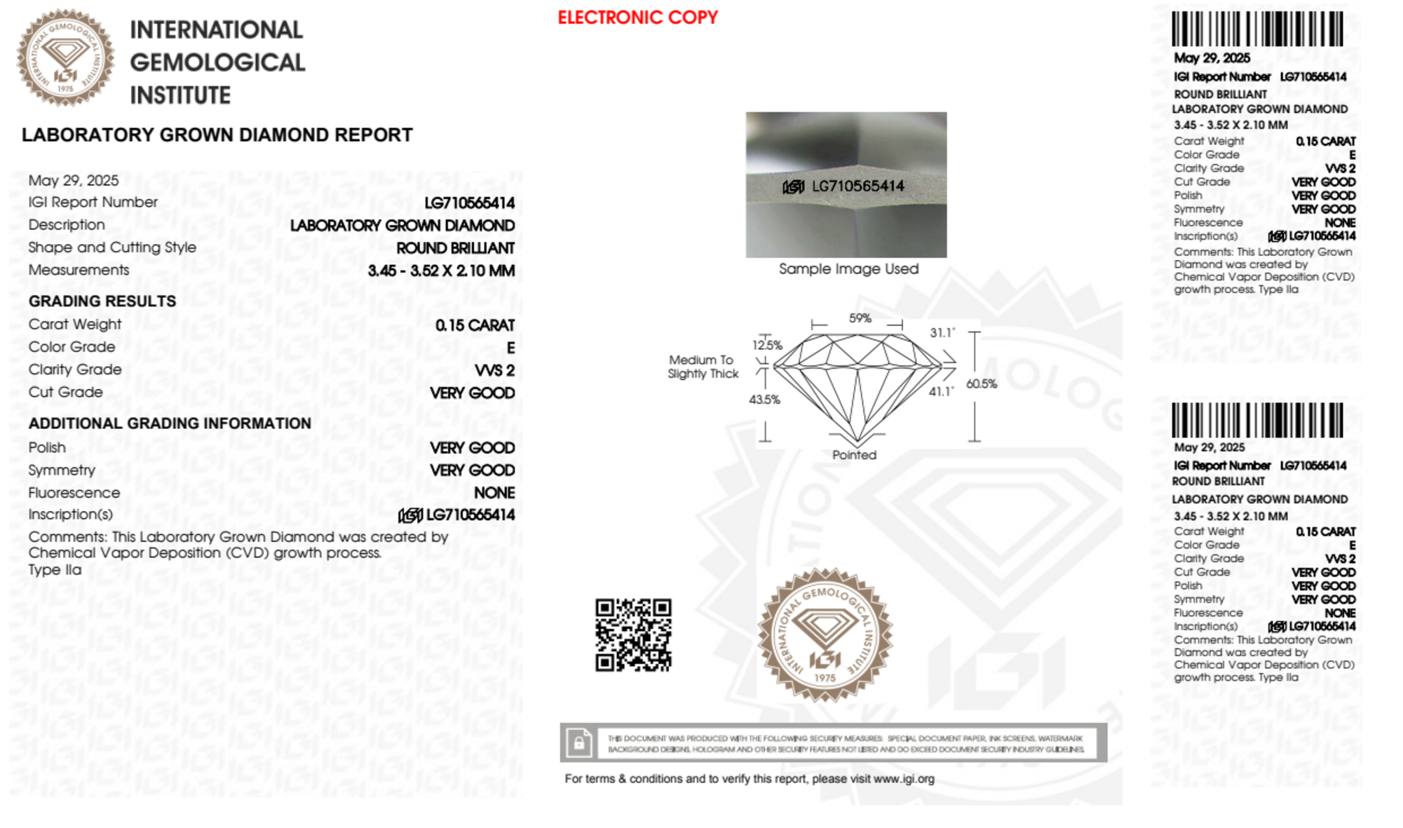 Your 0.15 carat Round lab diamond is graded E color (Colorless), and you can read more about E color diamonds here.