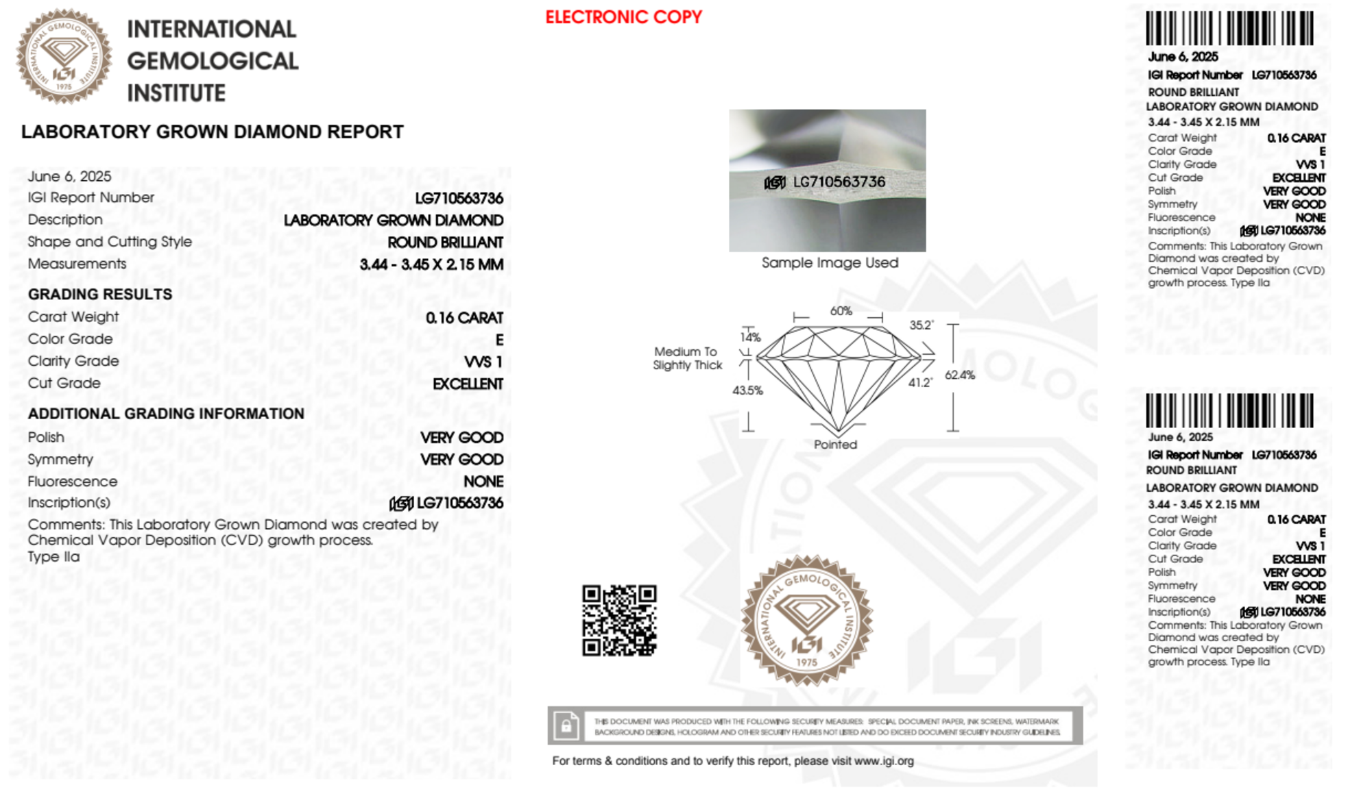 Your 0.16 carat Round lab diamond is graded E color (Colorless), and you can read more about E color diamonds here.