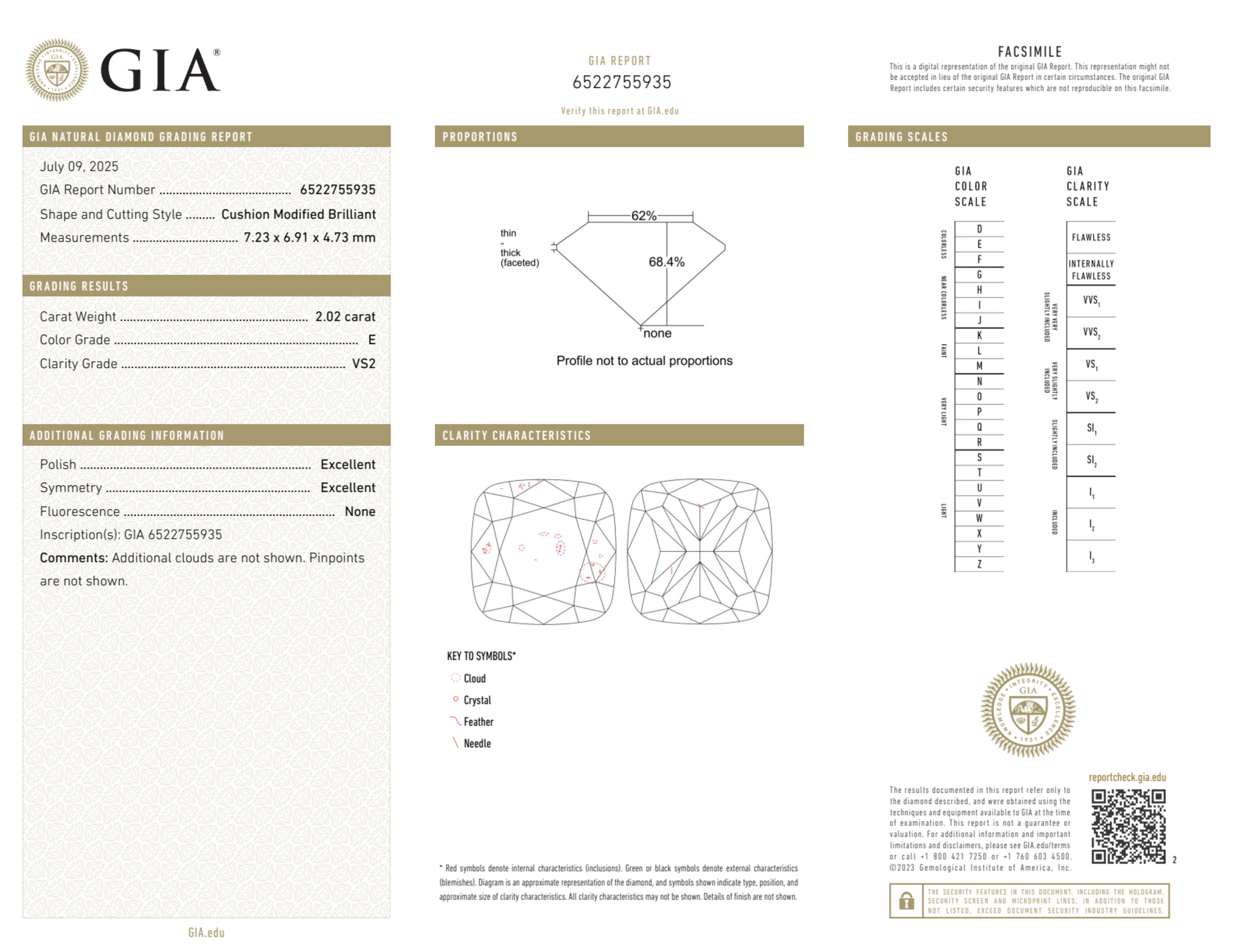 Your 2.02 carat Cushion natural diamond is graded E color (Colorless), and you can read more about E color diamonds here.