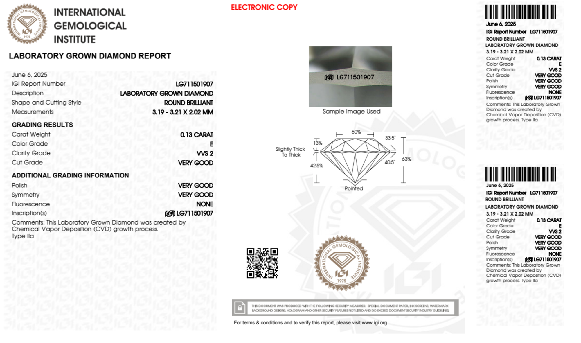 Your 0.13 carat Round lab diamond is graded E color (Colorless), and you can read more about E color diamonds here.