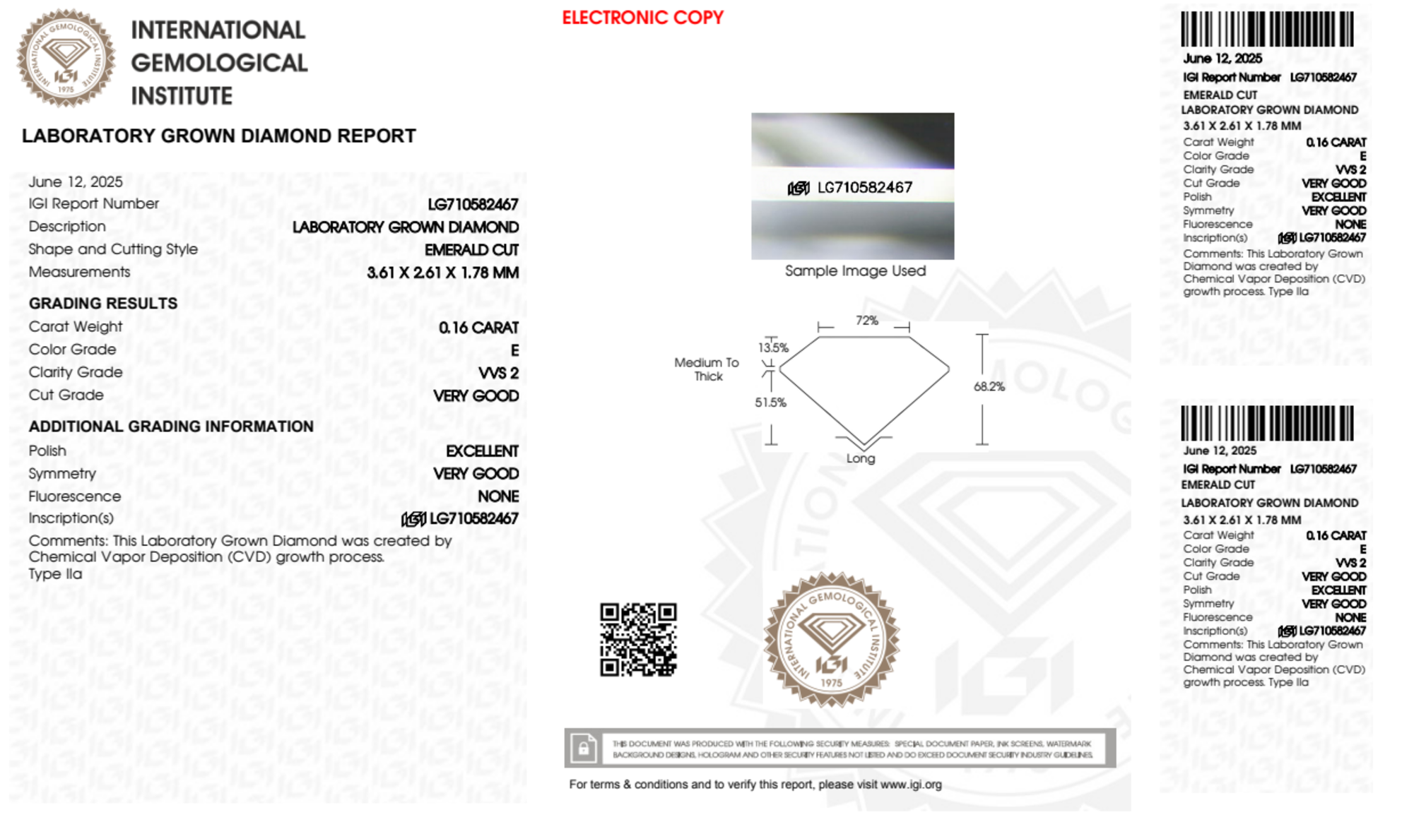 Your 0.16 carat Emerald lab diamond is graded E color (Colorless), and you can read more about E color diamonds here.