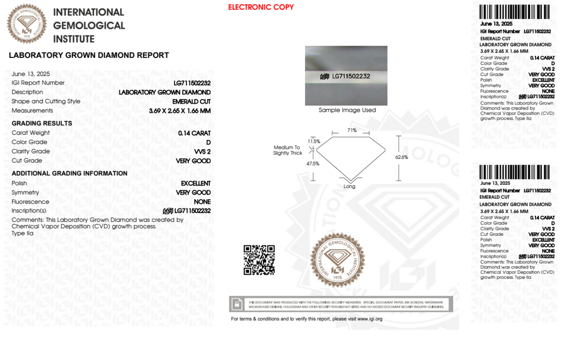 Your 0.14 carat Emerald lab diamond is graded D color (Colorless), and you can read more about D color diamonds here.