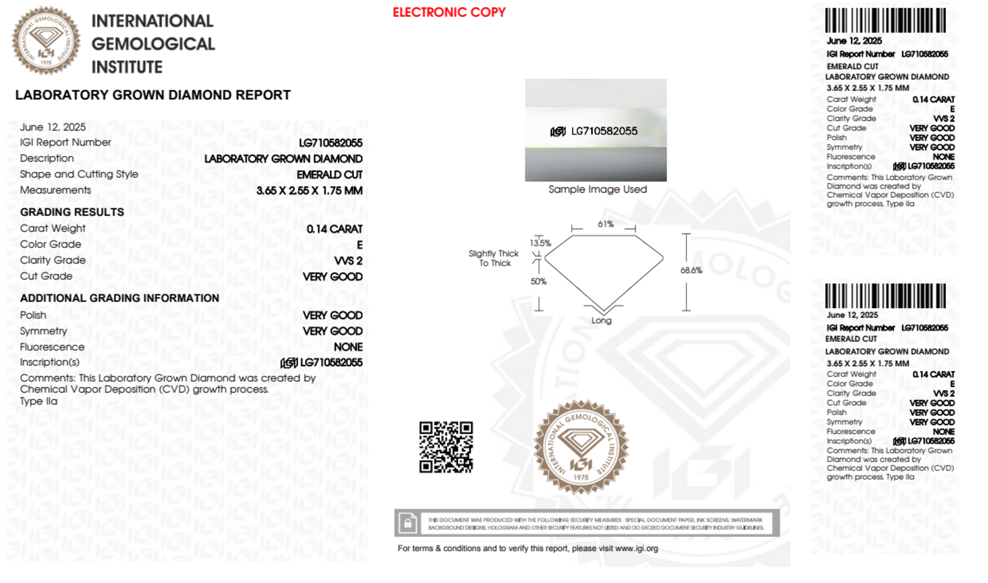 Your 0.14 carat Emerald lab diamond is graded E color (Colorless), and you can read more about E color diamonds here.