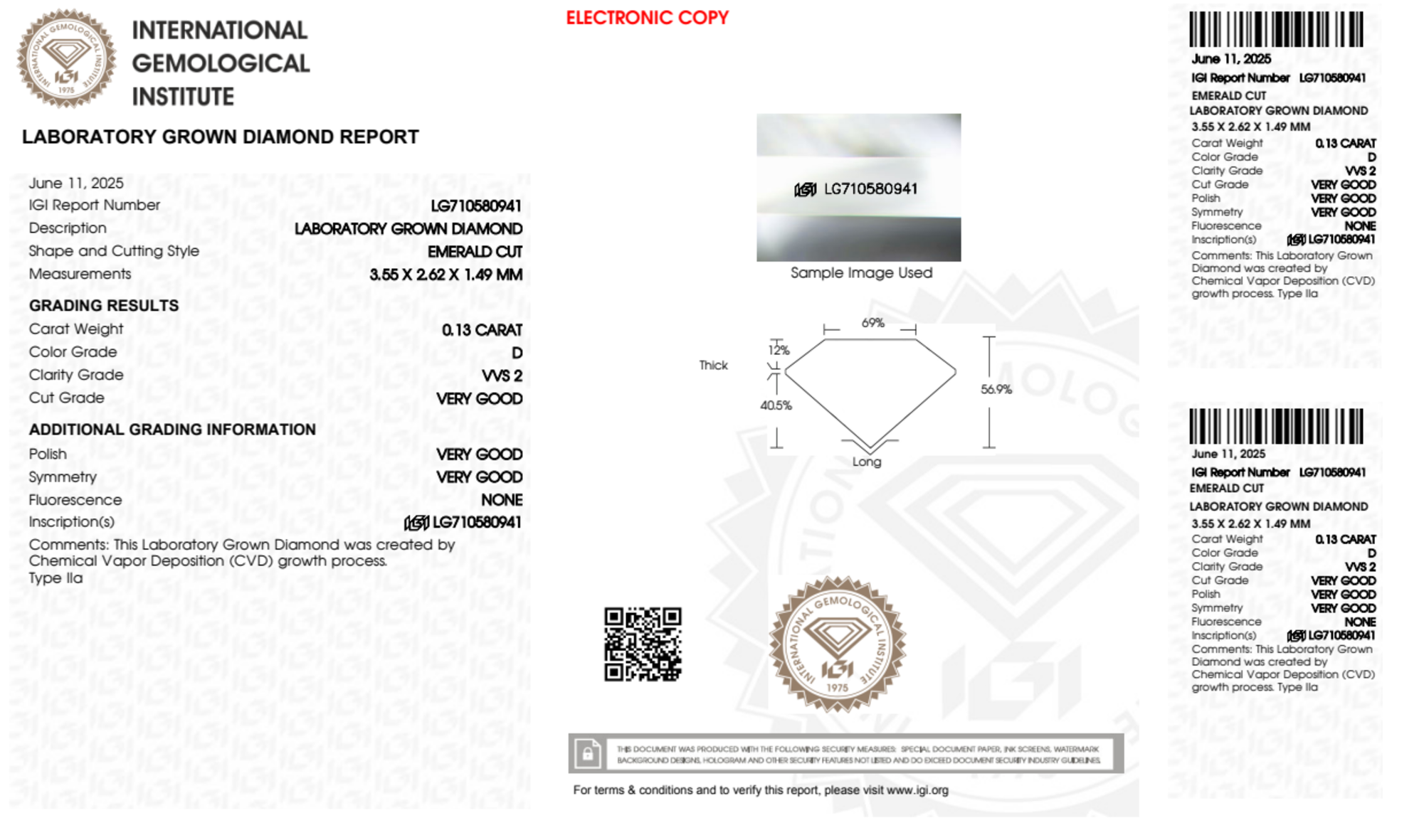 Your 0.13 carat Emerald lab diamond is graded D color (Colorless), and you can read more about D color diamonds here.