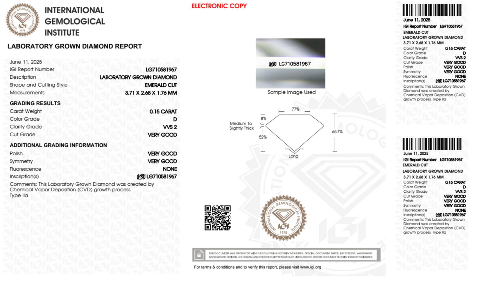 Your 0.15 carat Emerald lab diamond is graded D color (Colorless), and you can read more about D color diamonds here.