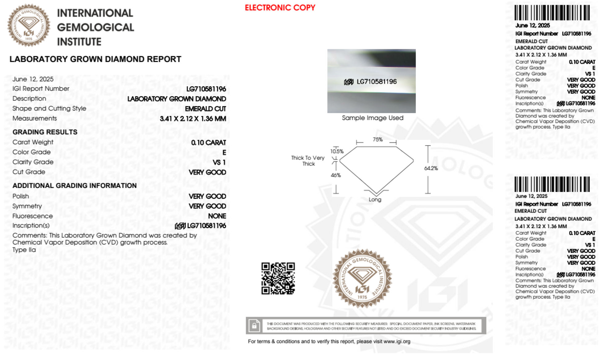 Your 0.10 carat Emerald lab diamond is graded E color (Colorless), and you can read more about E color diamonds here.