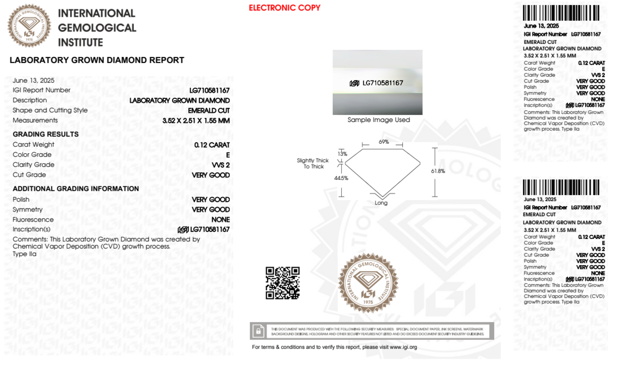 Your 0.12 carat Emerald lab diamond is graded E color (Colorless), and you can read more about E color diamonds here.