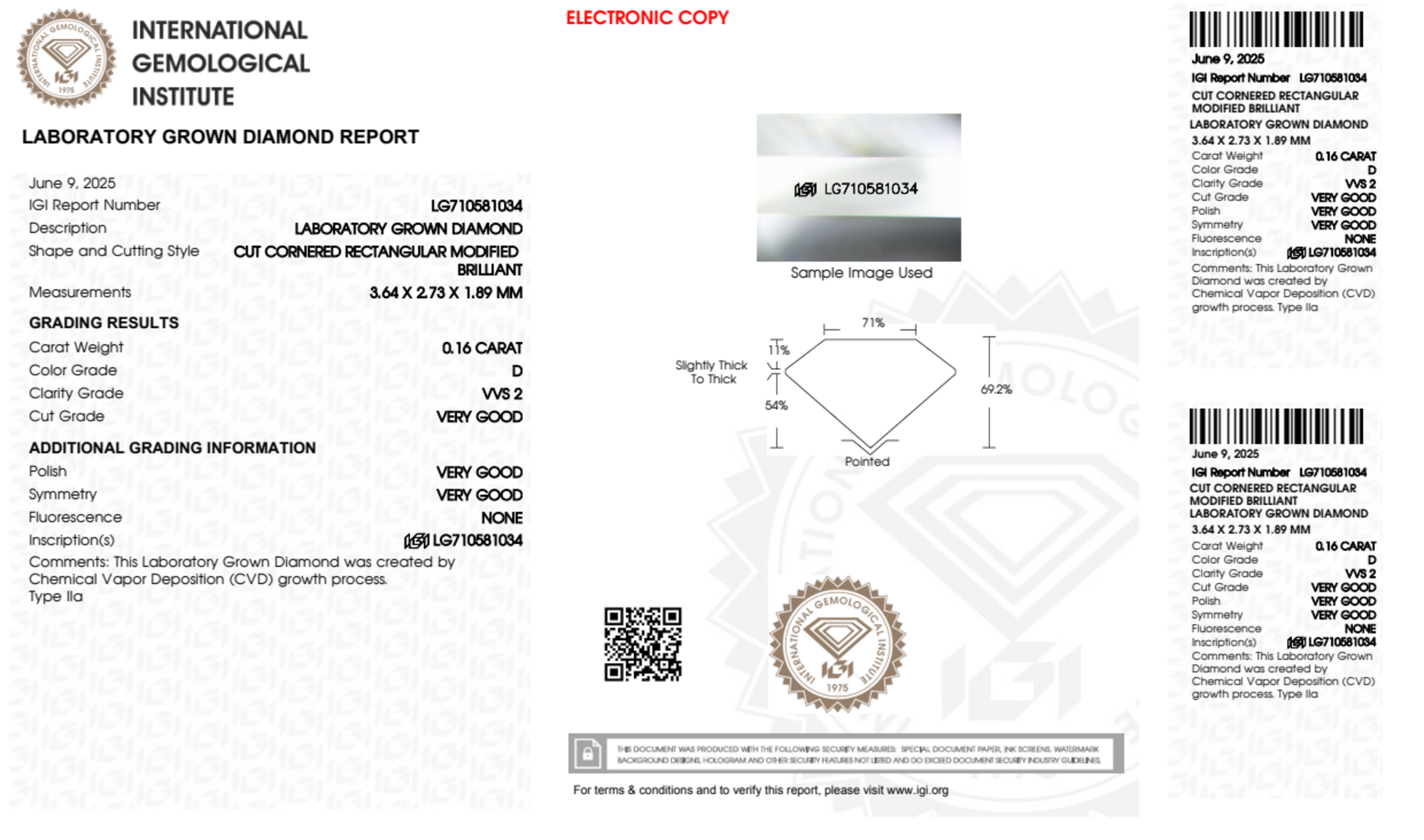Your 0.16 carat Radiant lab diamond is graded D color (Colorless), and you can read more about D color diamonds here.