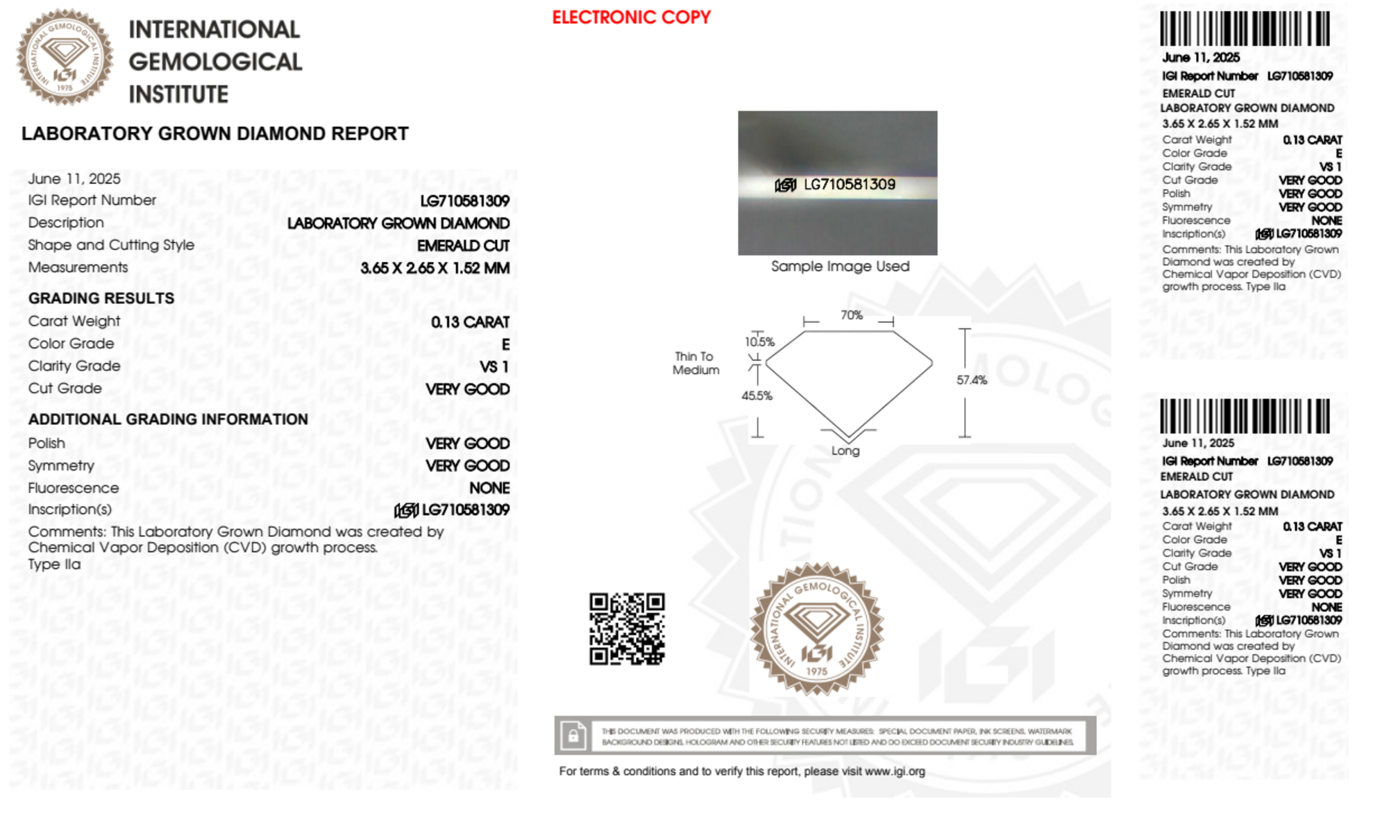 Your 0.13 carat Emerald lab diamond is graded E color (Colorless), and you can read more about E color diamonds here.
