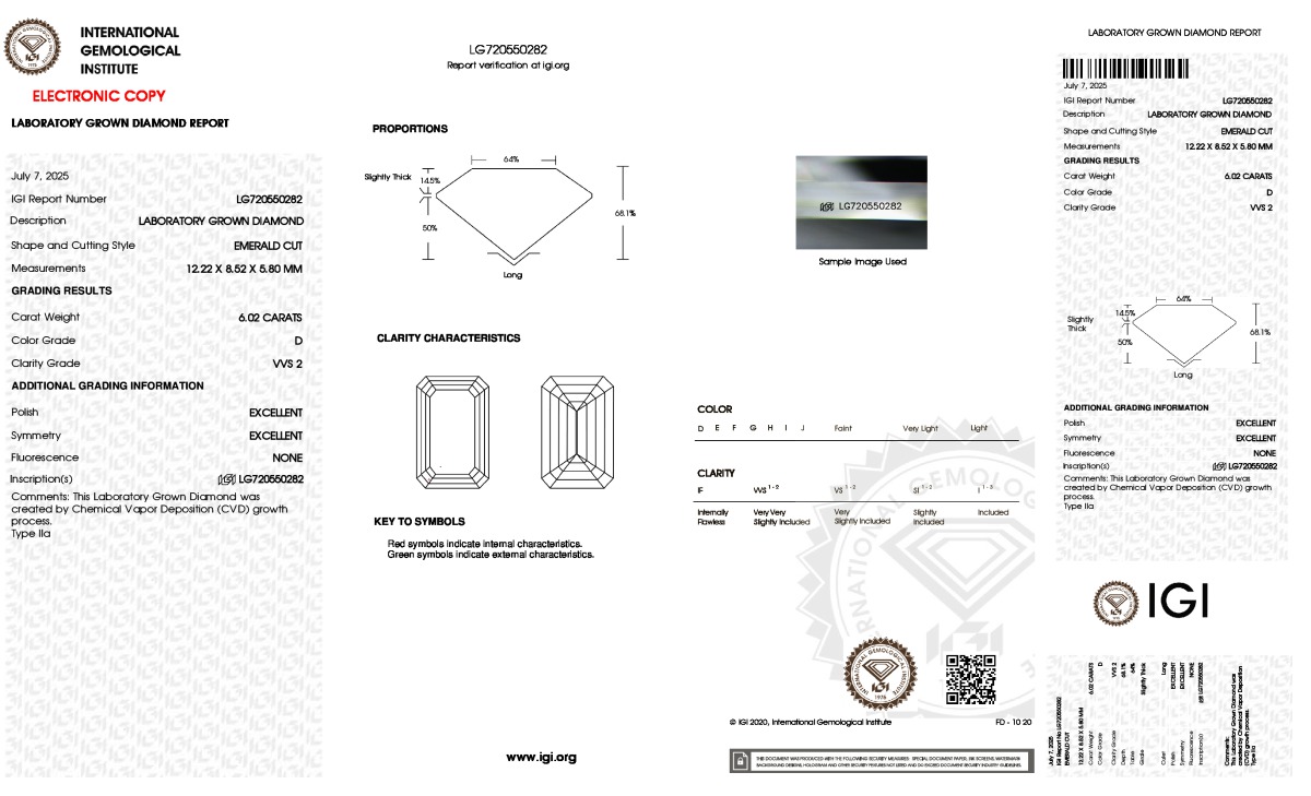 Your 6.02 carat Emerald lab diamond is graded D color (Colorless), and you can read more about D color diamonds here.