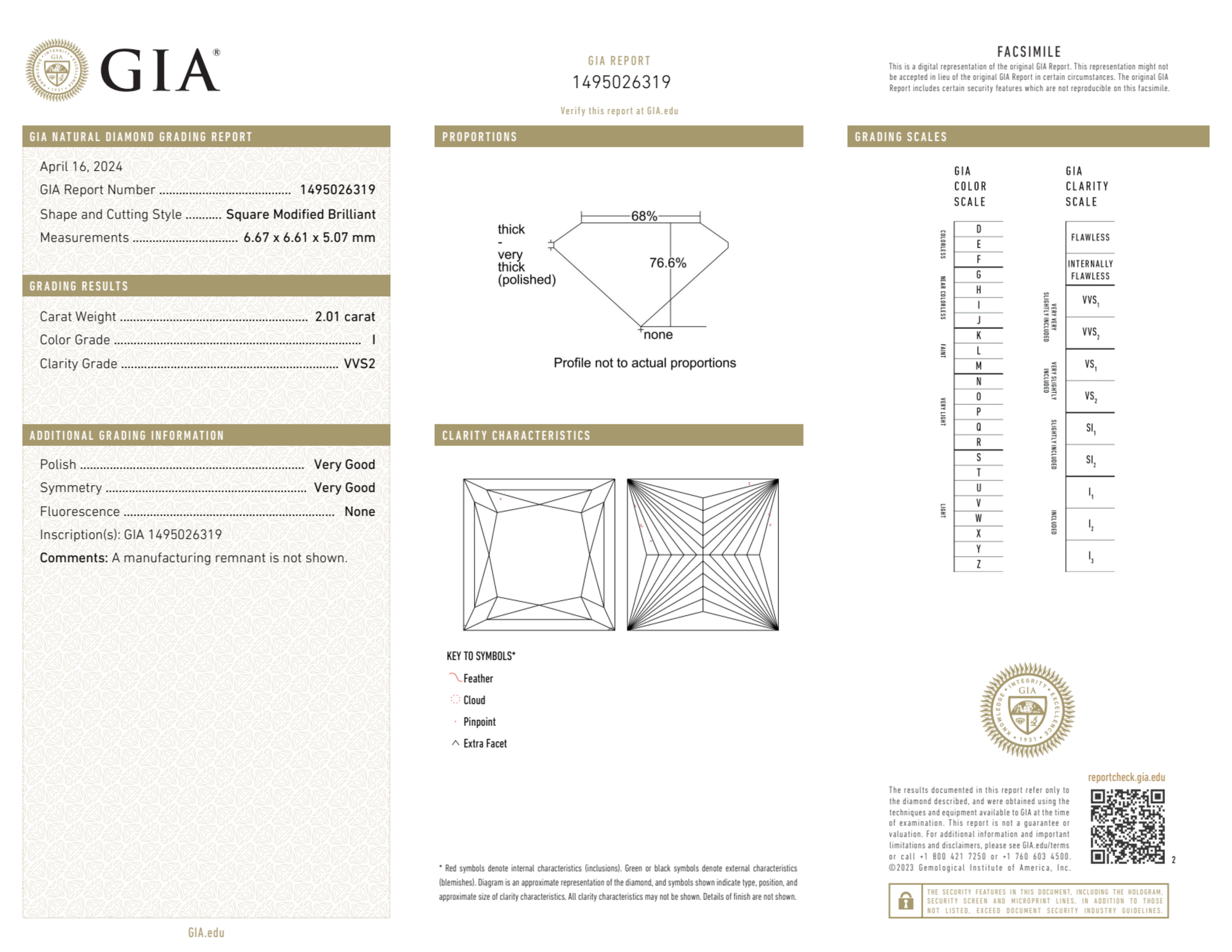 Your 2.01 carat Princess natural diamond is graded VVS2 clarity, which stands for Very Very Slightly Included 2. Read more about VVS2 clarity diamonds here, or learn more about diamond clarity in general here.