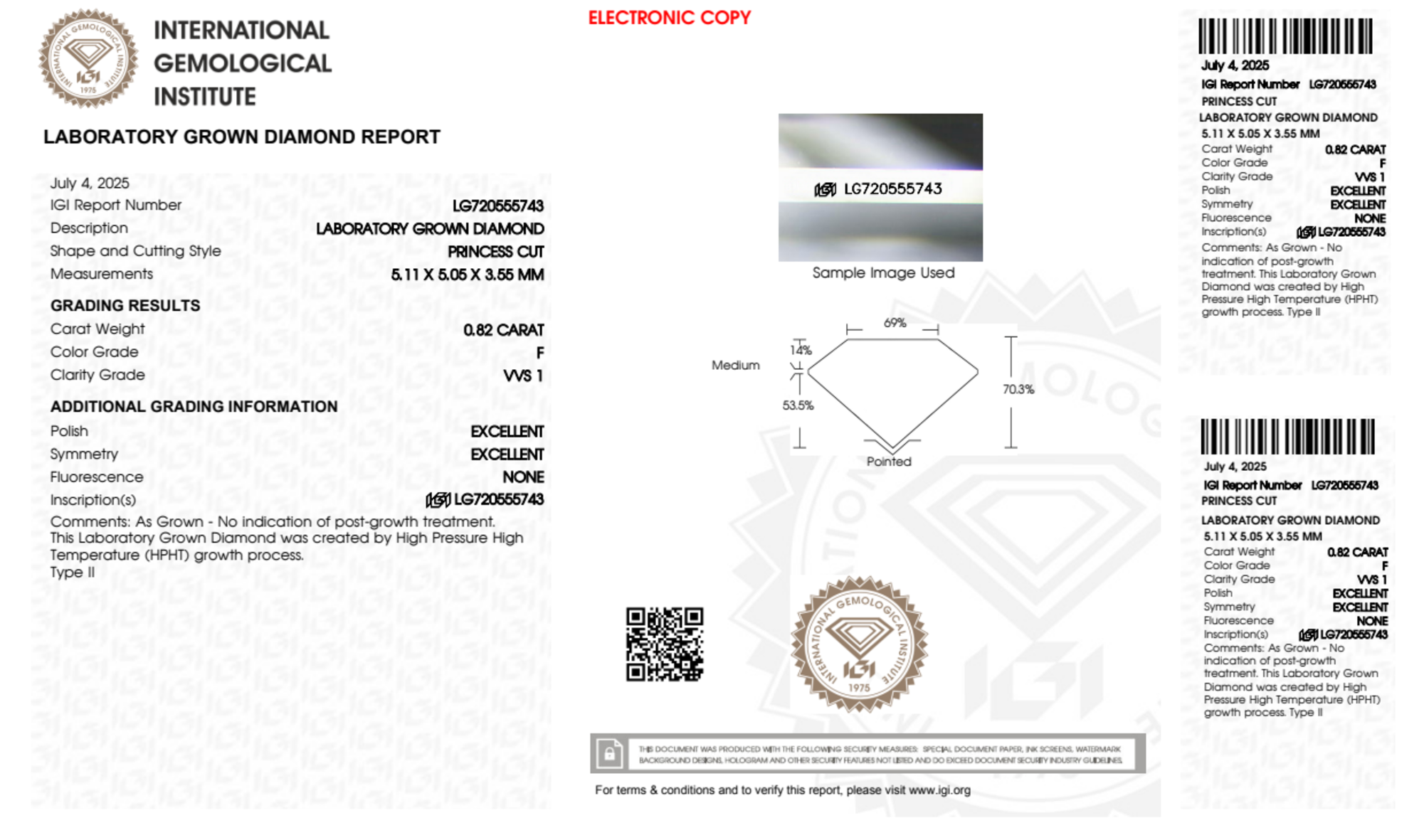 Your 0.82 carat Princess lab diamond is graded VVS1 clarity, which stands for Very Very Slightly Included 1. Read more about VVS1 clarity diamonds here, or learn more about diamond clarity in general here.