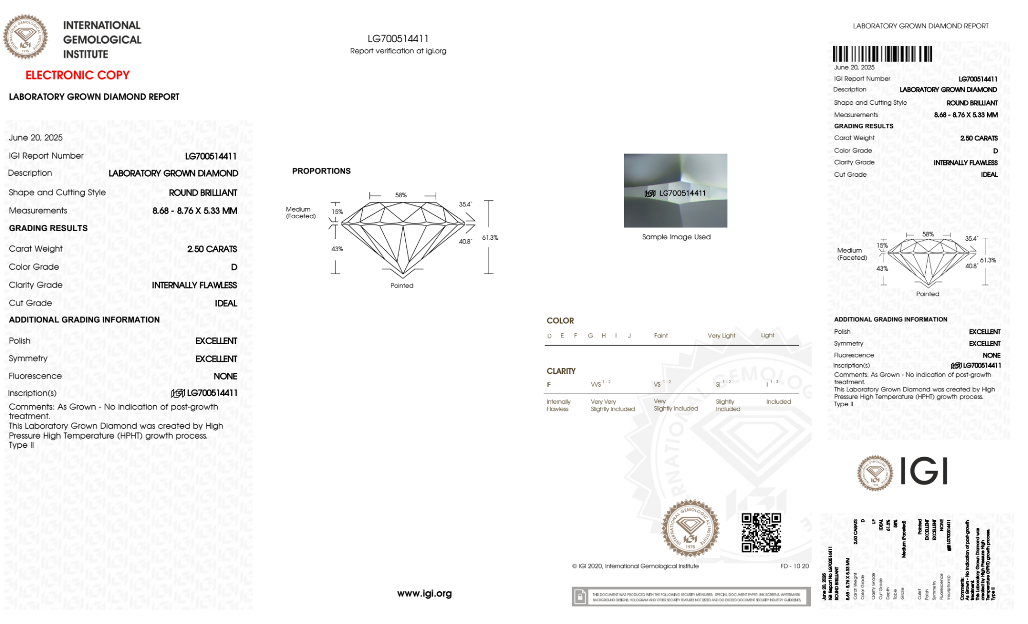 Your 2.50 carat Round lab diamond is graded IF clarity, which stands for Internally Flawless. Read more about IF clarity diamonds here, or learn more about diamond clarity in general here.