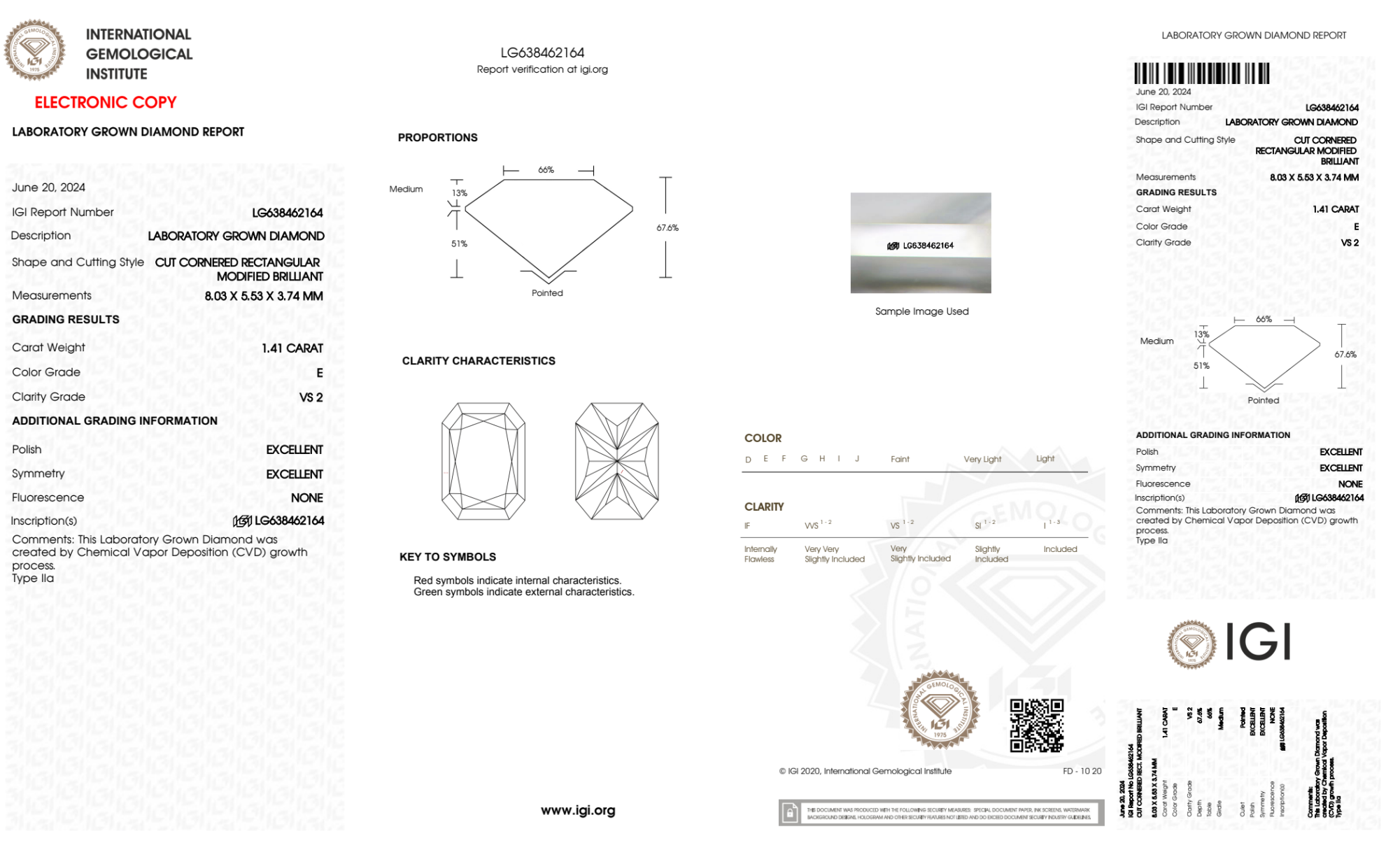 Your 1.41 carat Radiant lab diamond is graded E color (Colorless), and you can read more about E color diamonds here.