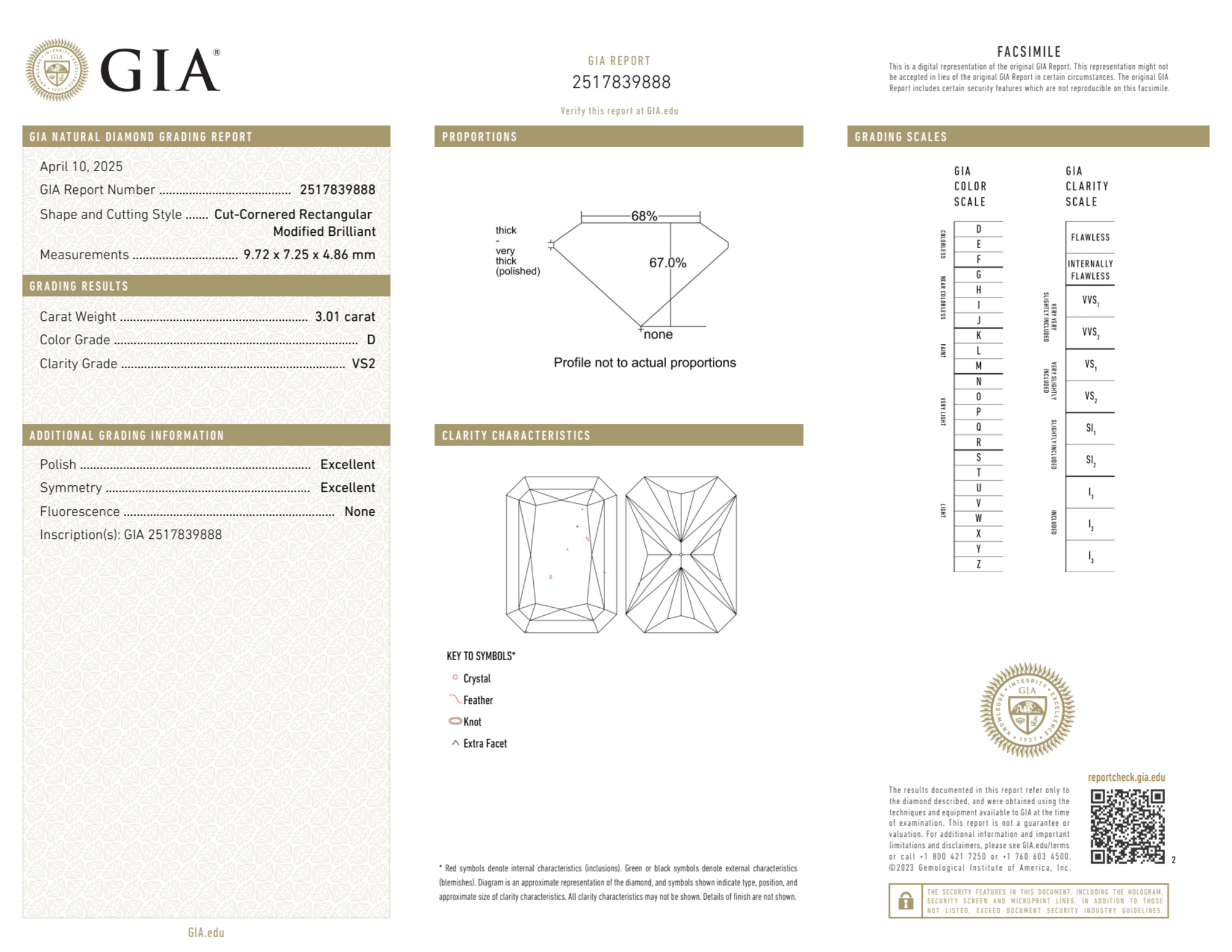 Your 3.01 carat Radiant natural diamond is graded D color (Colorless), and you can read more about D color diamonds here.