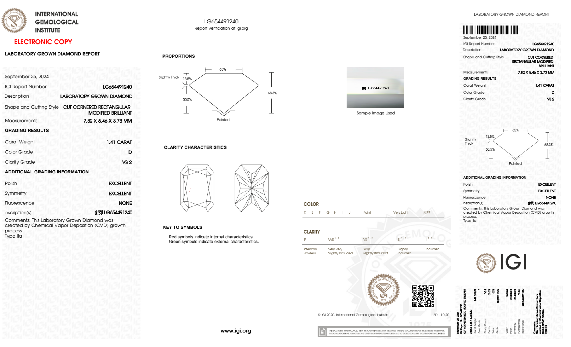 Your 1.41 carat Radiant lab diamond is graded D color (Colorless), and you can read more about D color diamonds here.