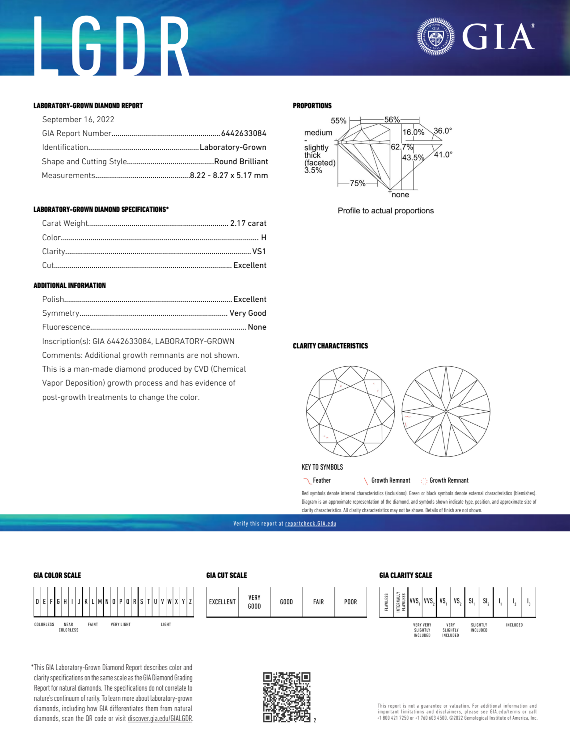 Your 2.17 carat Round lab diamond is graded H color (Near Colorless), and you can read more about H color diamonds here.