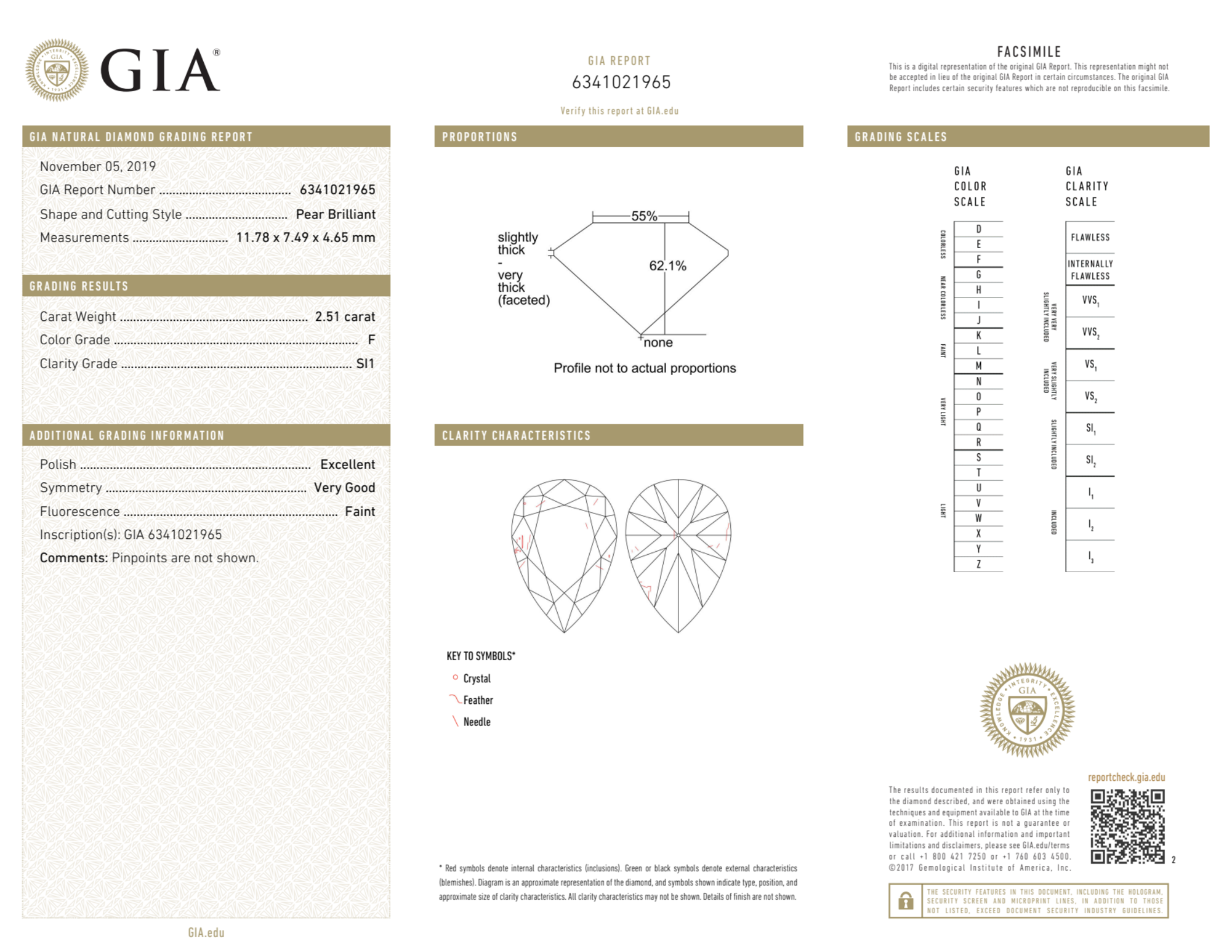 Your 2.51 carat Pear natural diamond is graded F color (Colorless), and you can read more about F color diamonds here.
