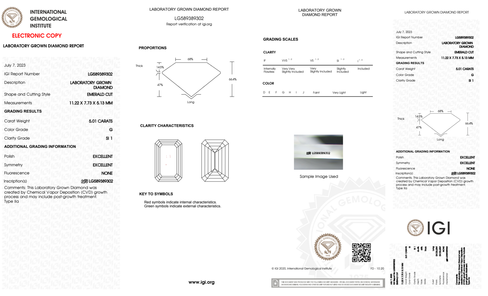 Your 5.01 carat Emerald lab diamond is graded SI1 clarity, which stands for Slightly Included 1. Read more about SI1 clarity diamonds here, or learn more about diamond clarity in general here.