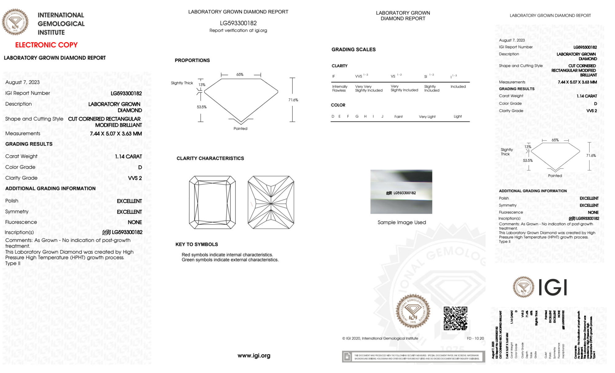 Your 1.14 carat Radiant lab diamond is graded D color (Colorless), and you can read more about D color diamonds here.