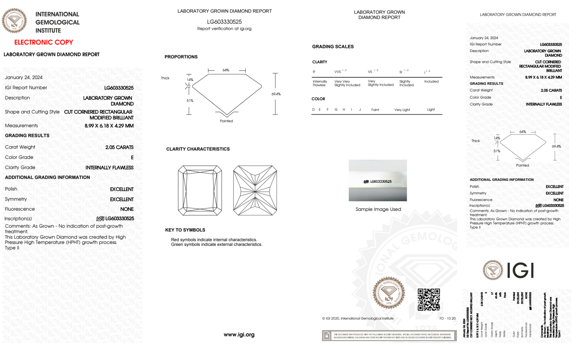 Your 2.05 carat Radiant lab diamond is graded E color (Colorless), and you can read more about E color diamonds here.