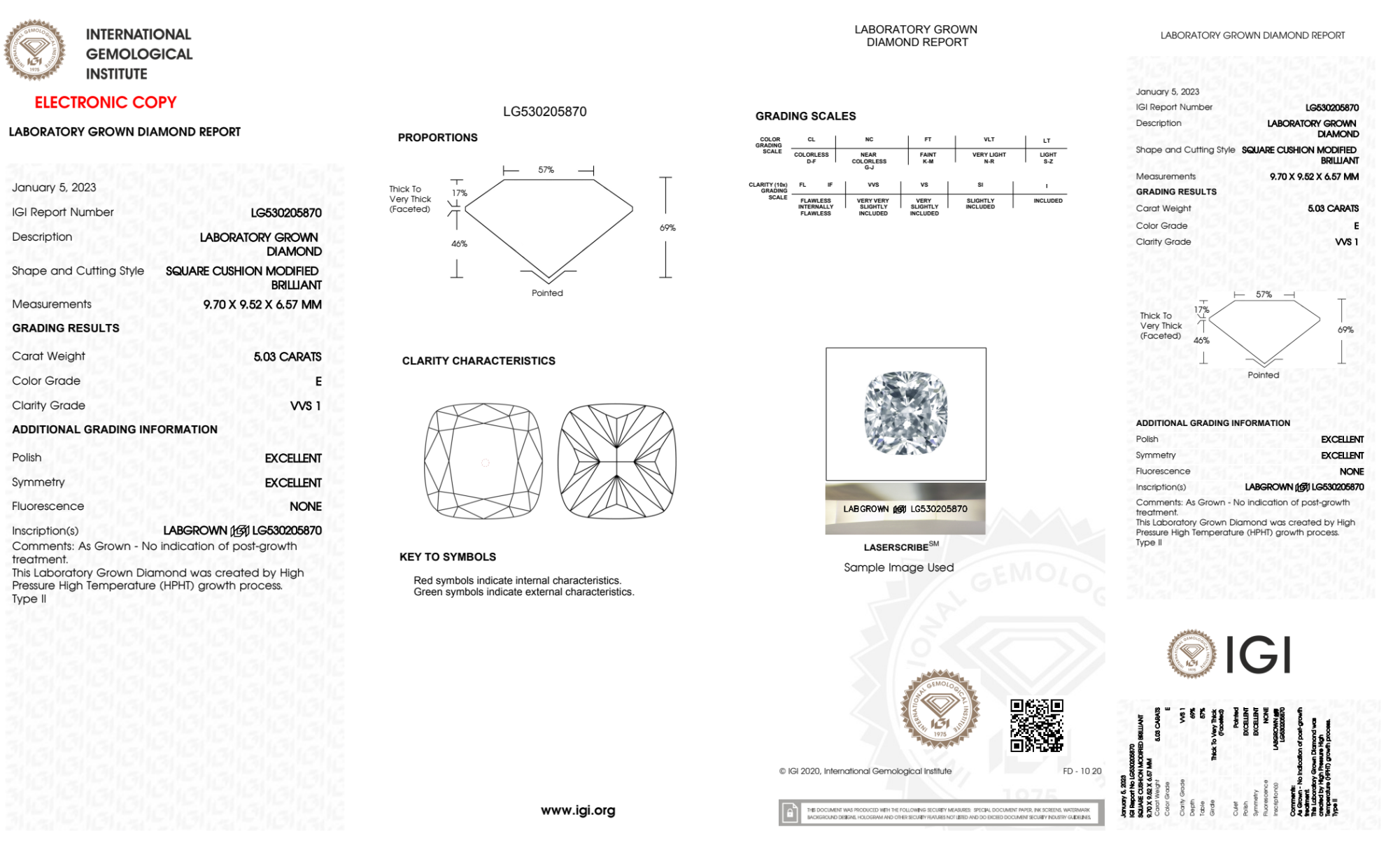 Your 5.03 carat Cushion lab diamond is graded E color (Colorless), and you can read more about E color diamonds here.