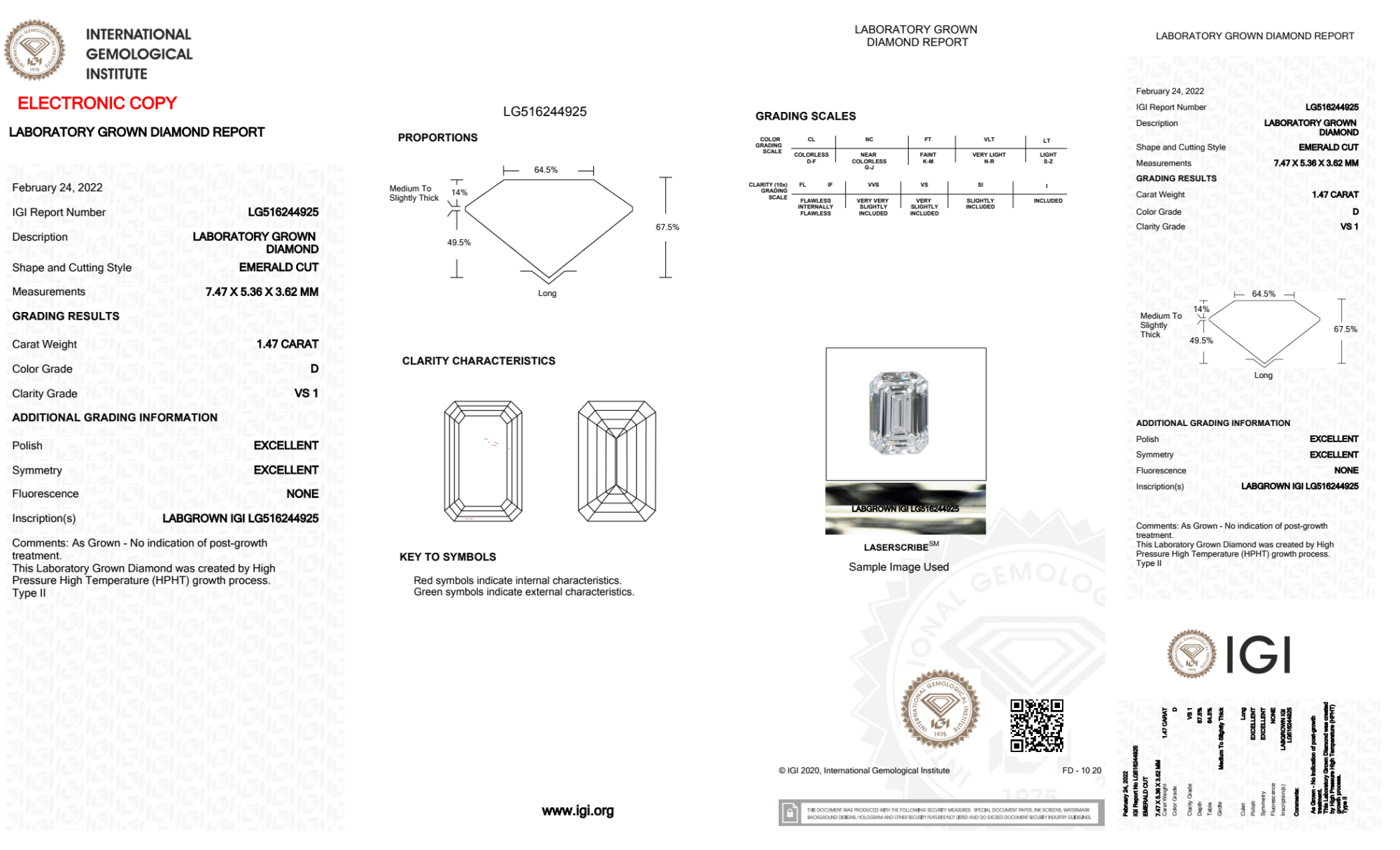 Your 1.47 carat Emerald lab diamond is graded D color (Colorless), and you can read more about D color diamonds here.